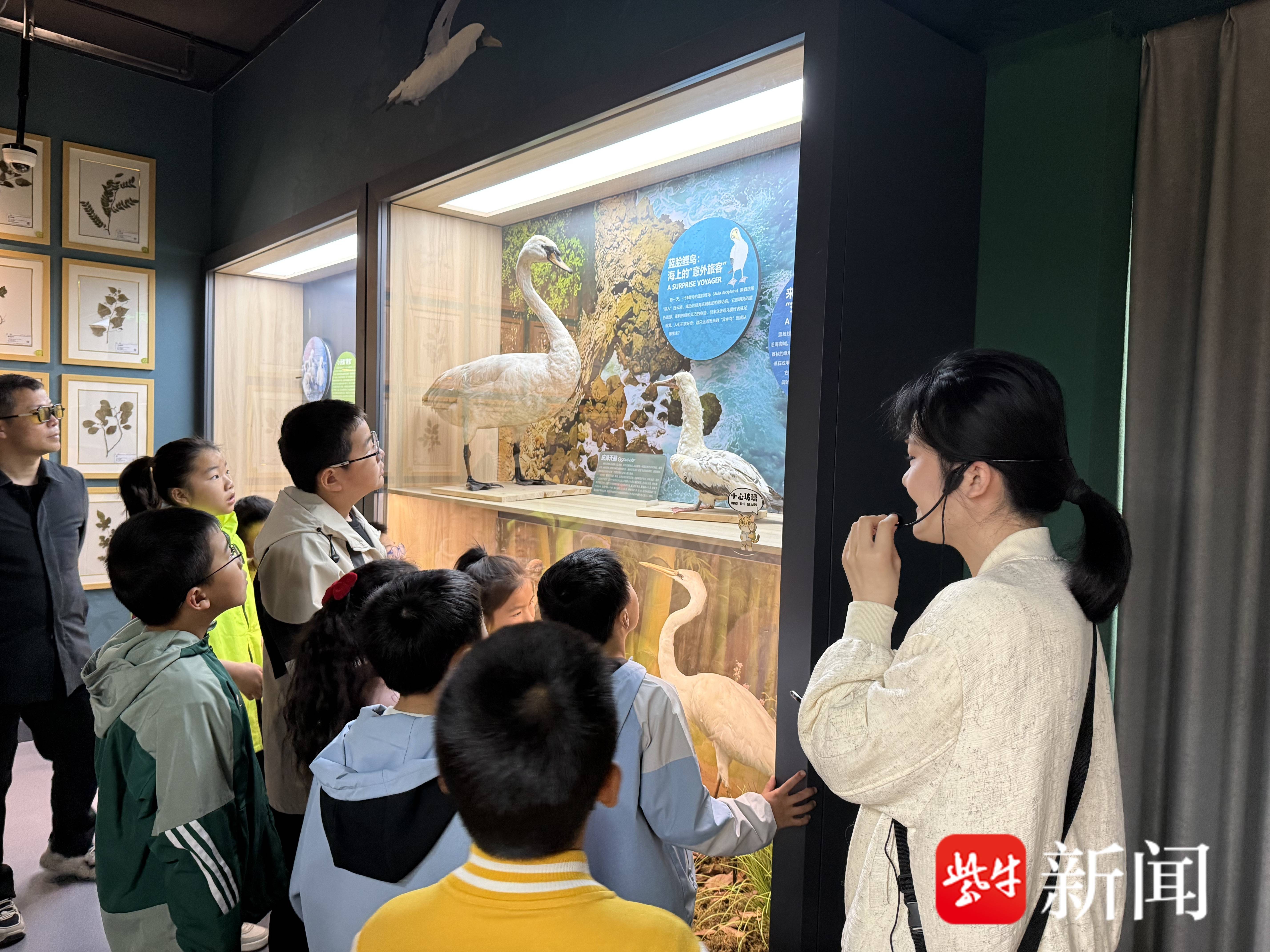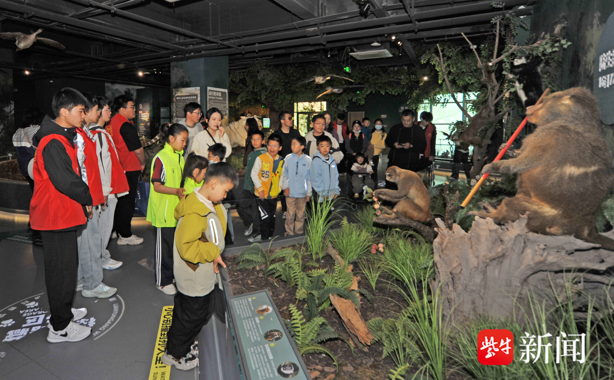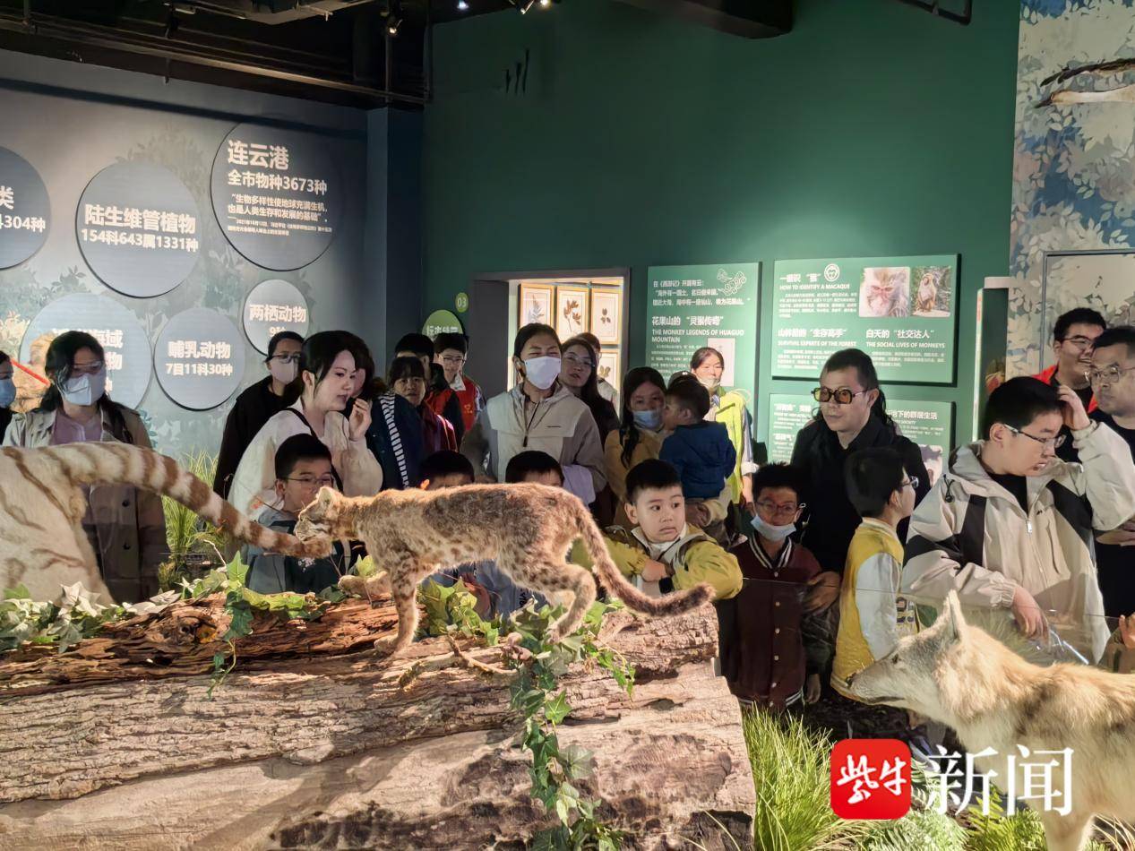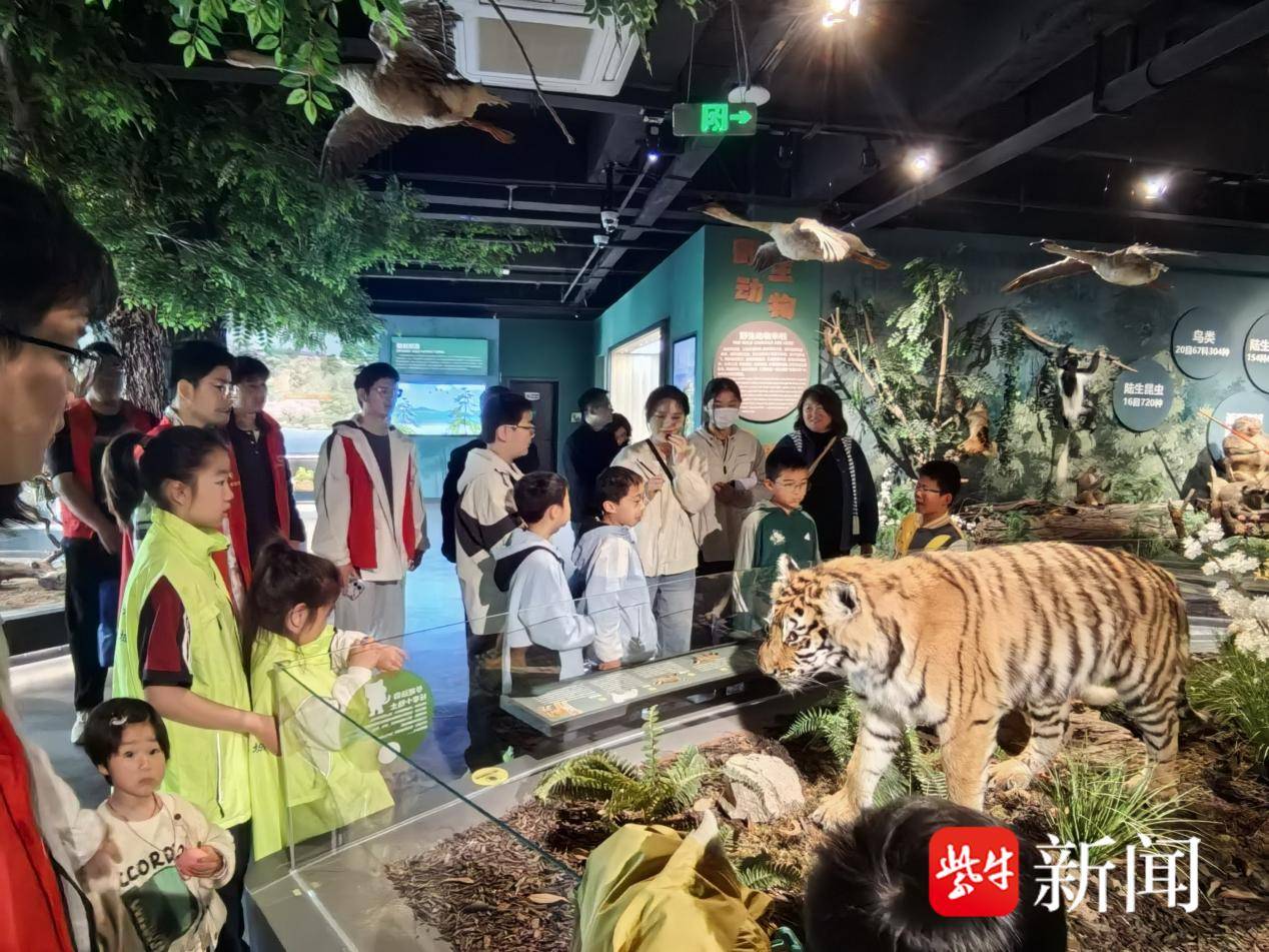 在“野生动物来啦”开放式螺旋状展台前,东北虎、孟加拉白虎、花果山猕猴、豹猫等栩栩如生的标本吸引了大家的目光,环形设计不仅方便多角度观赏,更象征着生命循环、生生不息的自然法则。孩子们驻足观察、轻声交流,结合沉浸式剧场与数字化互动屏,详细了解各类野生动物的生活习性、分布范围及保护现状,其中花果山猕猴作为江苏唯一野生灵长类,其灵动模样让大家印象深刻,也让孩子们对本土珍稀物种有了更清晰的认知。