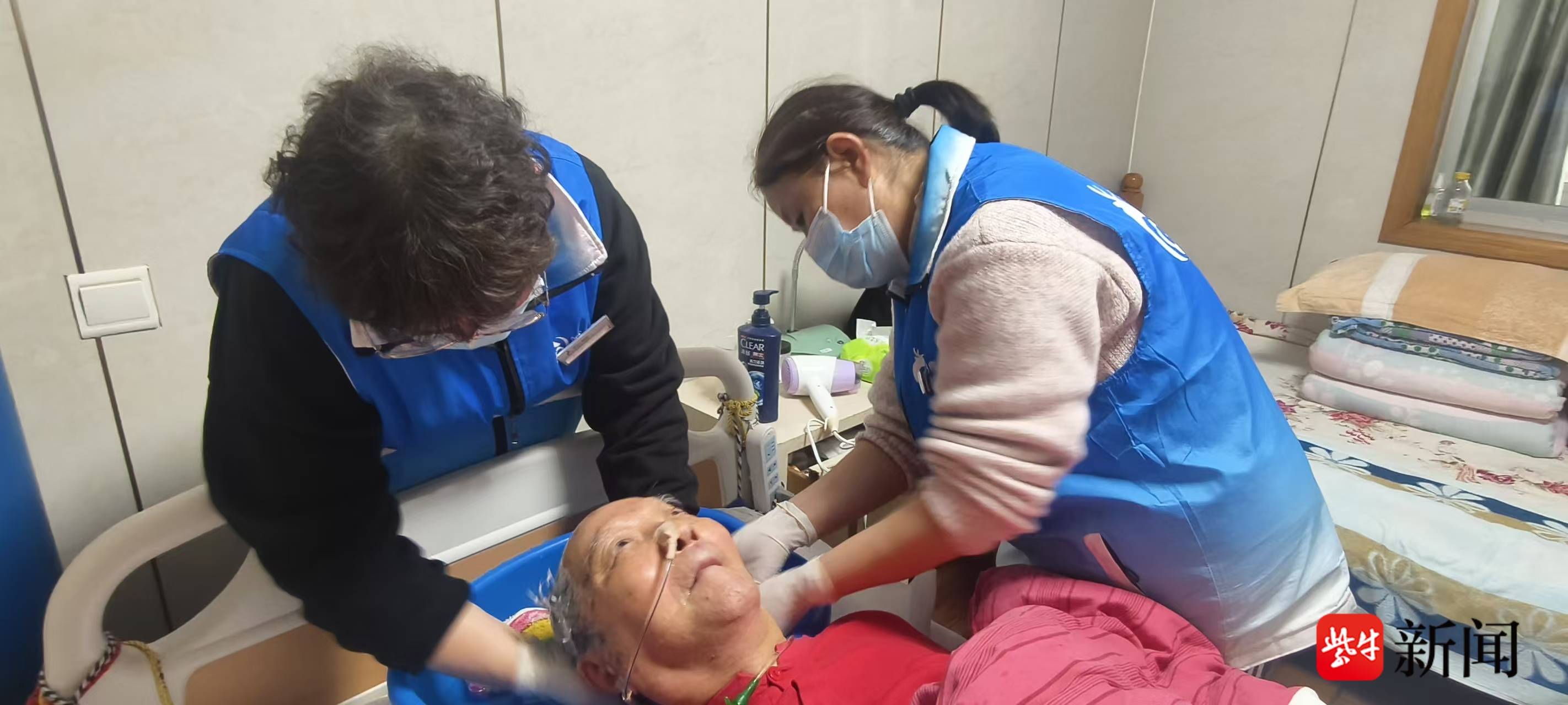 南通市崇川区学田苑4号楼106室,92岁的周启明因中风导致重度失能Ⅲ级,全身僵硬、无意识,已卧床20年,生活完全靠人照料。“以前根本没法弄,现在她们来了,洗澡、擦身这些重活都包了,我轻松太多了。”保姆郭方秀说。