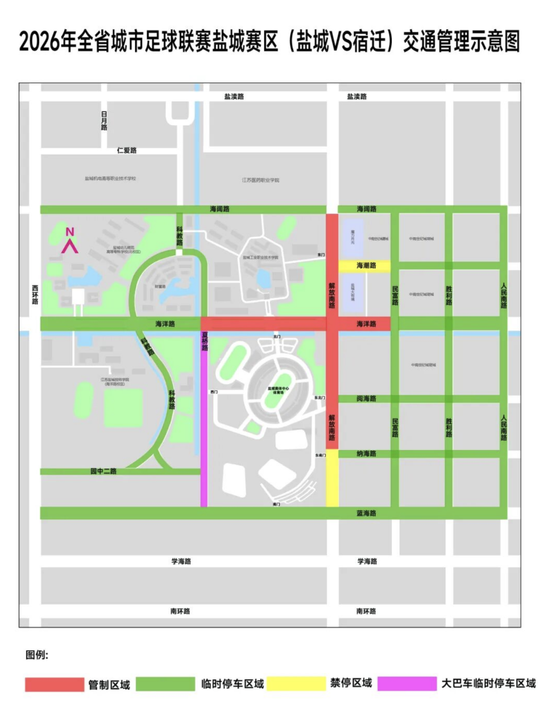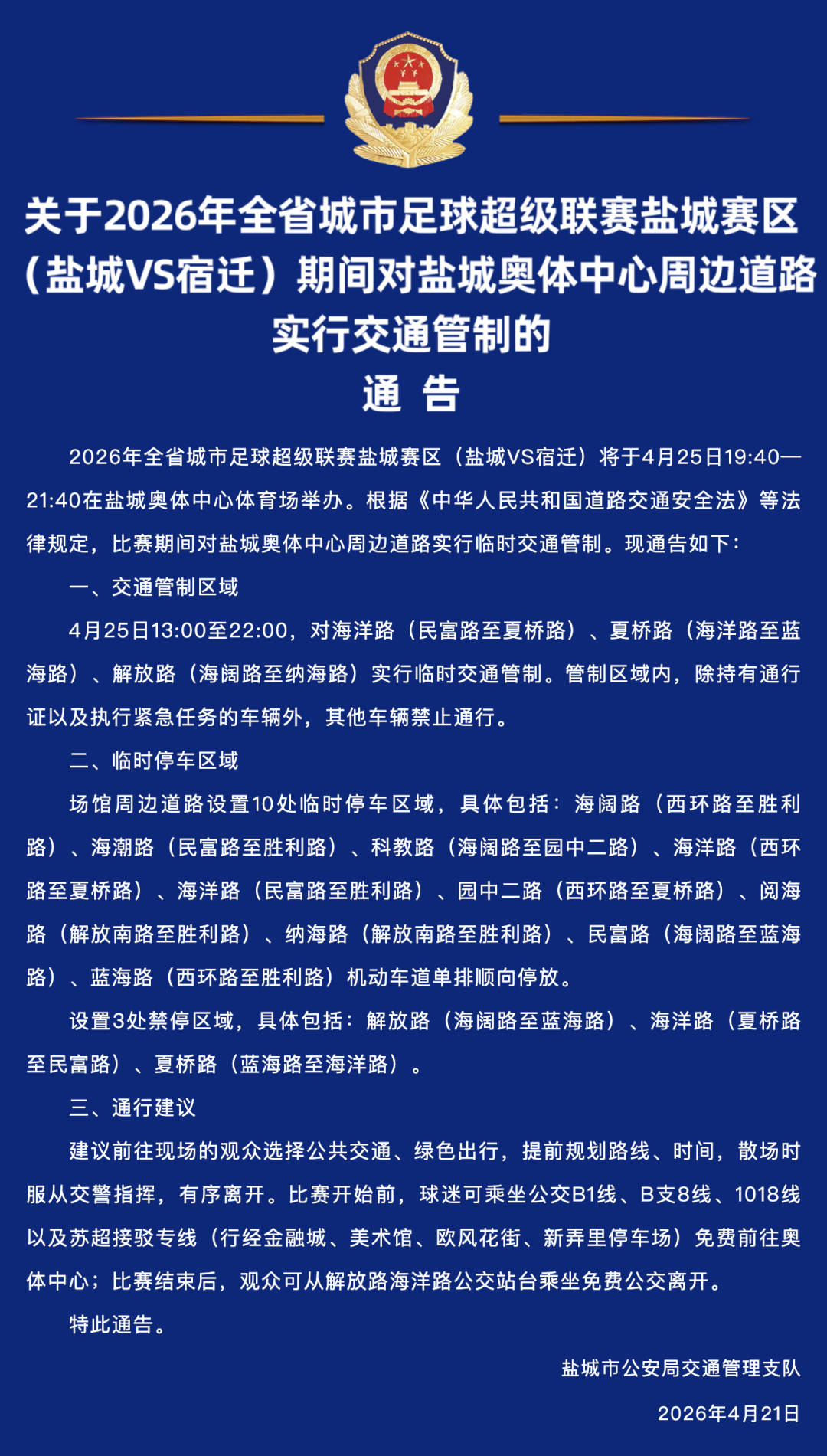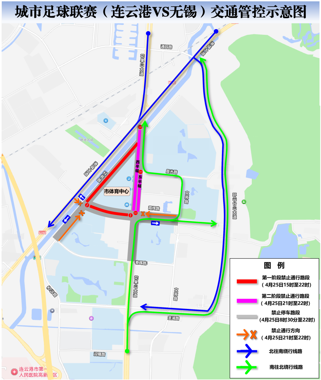 2026江苏省城市足球联赛(连云港VS无锡)比赛将于2026年4月25日19时40分在连云港市体育中心举行,为确保比赛期间道路安全、畅通、有序,给市民提供更好的交通出行环境,保障活动顺利举行,依据《中华人民共和国道路交通安全法》第三十九条之规定,对部分道路采取临时交通管控措施,现通告如下: