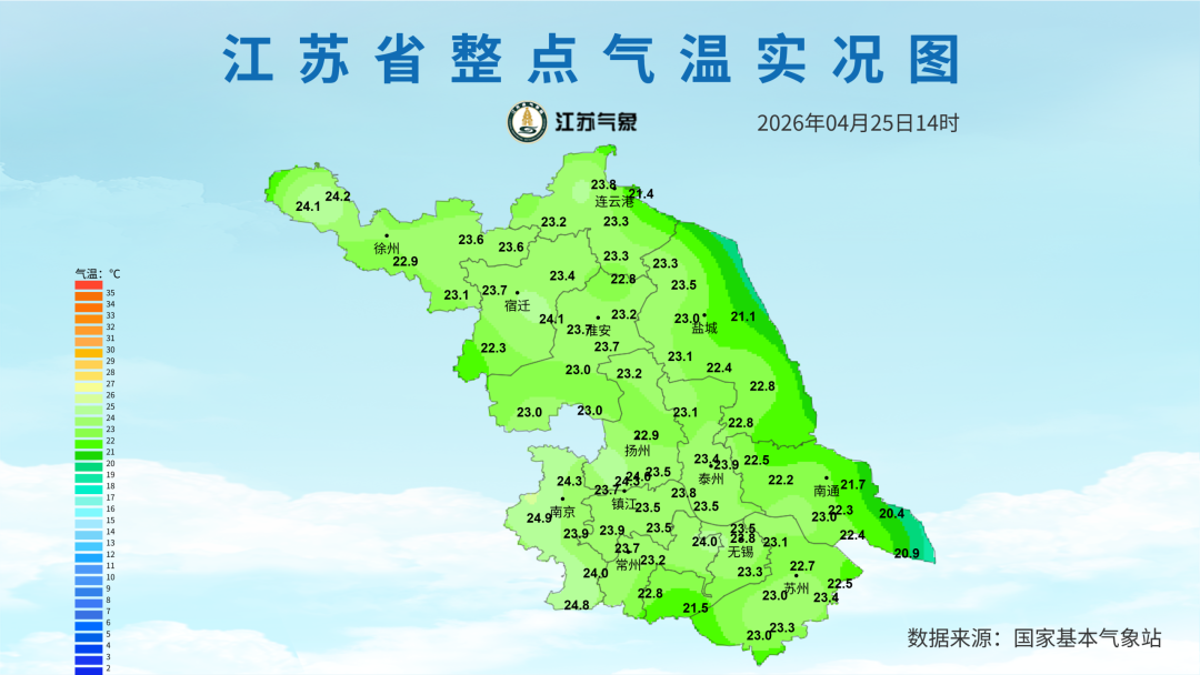 东部沿海和苏南部分地区在20-21℃