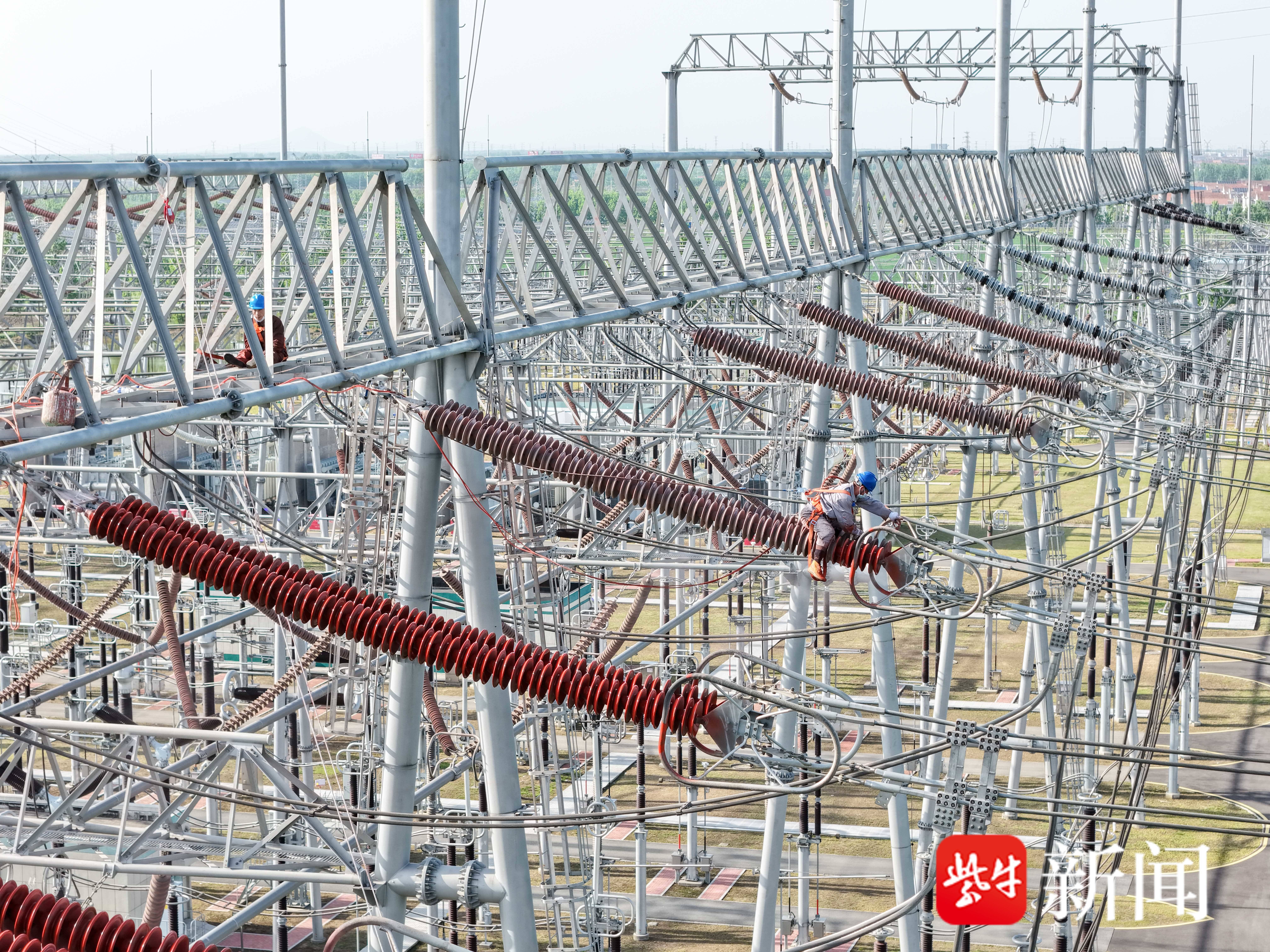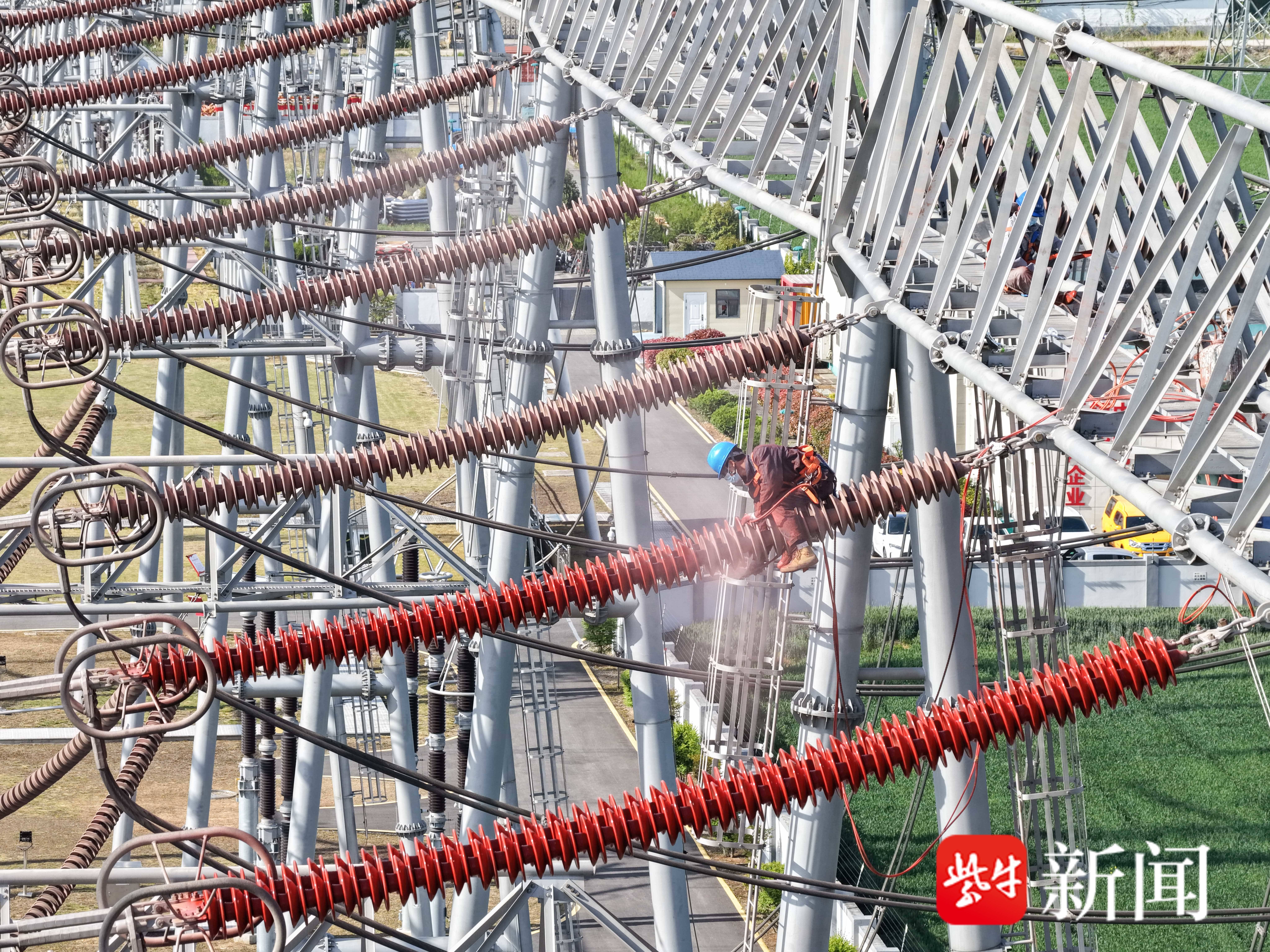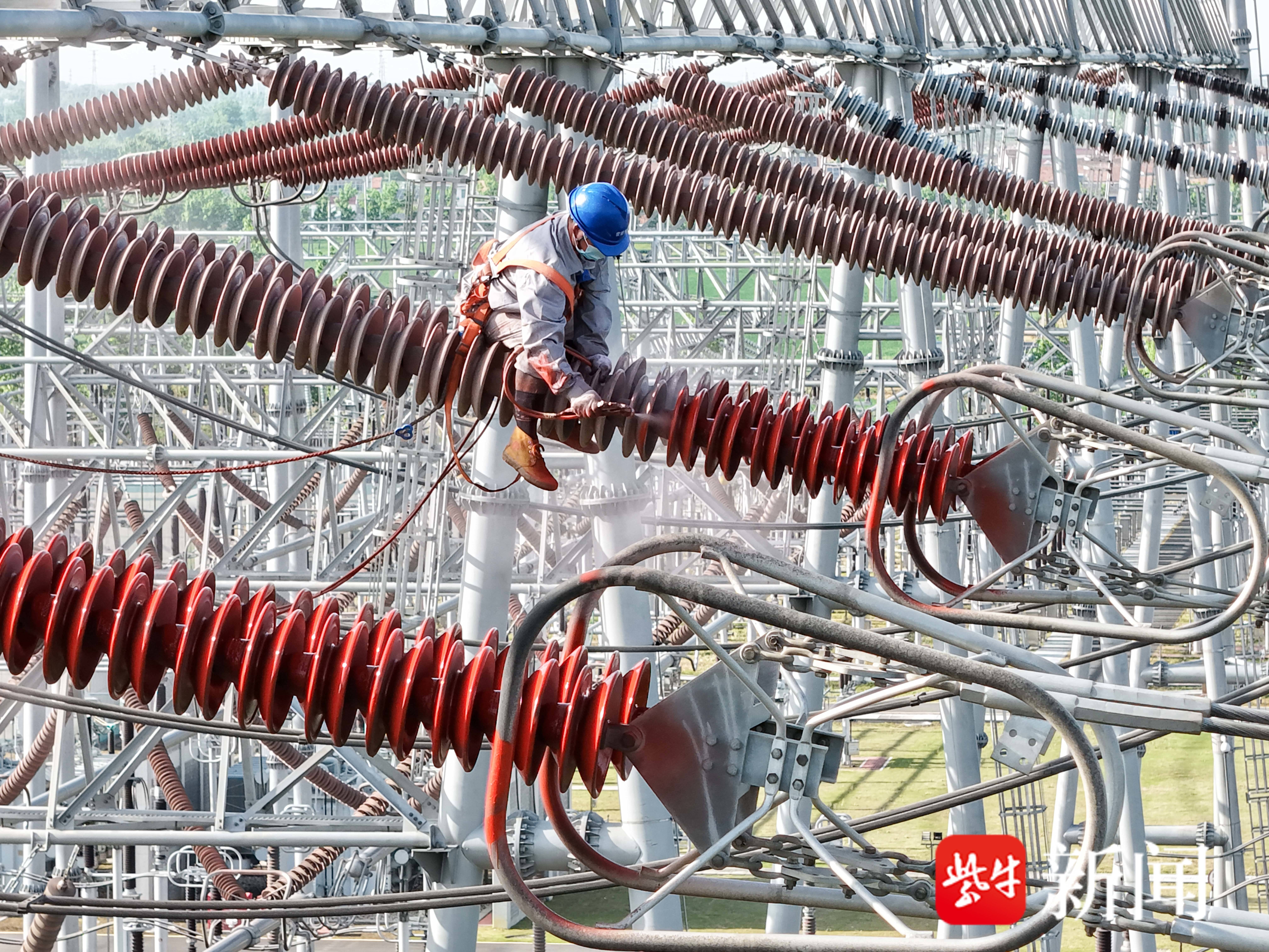 4月23日,国网连云港供电公司500千伏变电运检中心检修人员在500千伏芦塘5615线开展悬式绝缘子RTV喷涂作业,治理污闪隐患,提高电网设备运行可靠性。