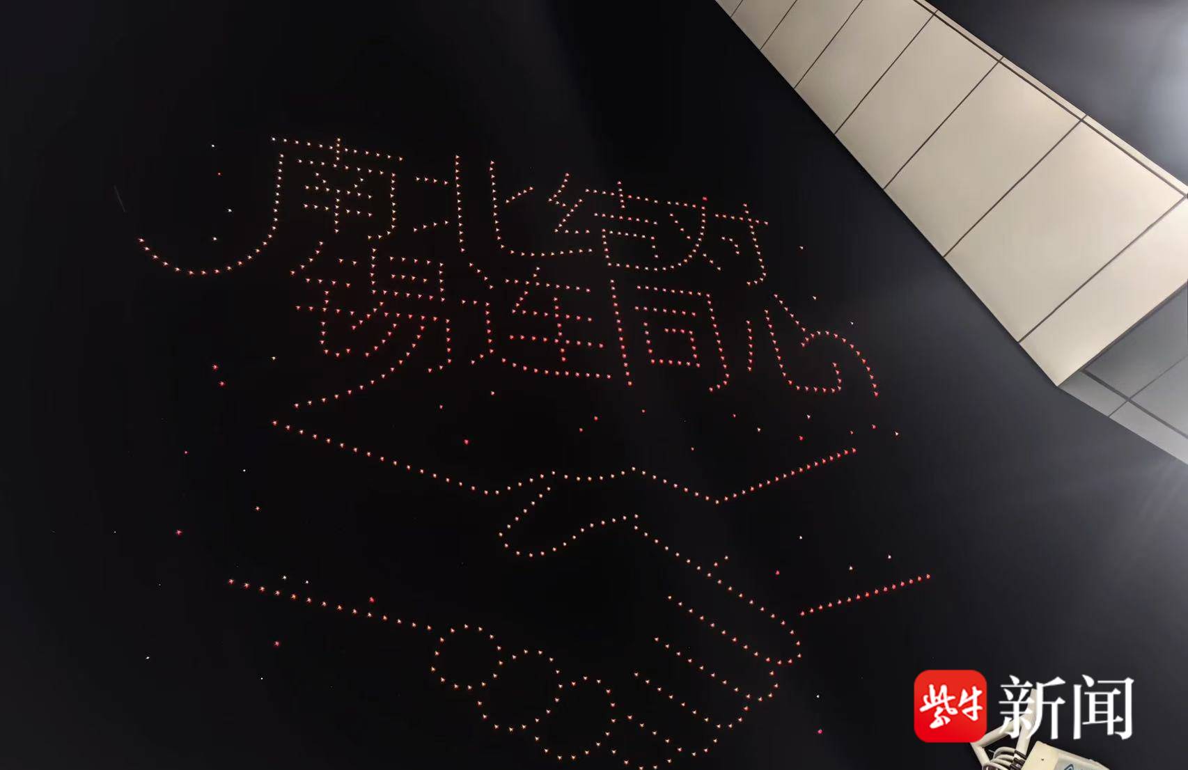 4月25日的连云港市体育中心,在比赛中场表演时,夜空中升起的无人机方阵成为一道独特的风景。数百架无人机在编程指令下整齐变换队形,最终在体育场上空精准定格出“南北结对 锡连同心”的字样,点亮了港城的夜空,也点燃了看台上两地观众的热情,为这场“南北德比”铺垫了温情的基调。