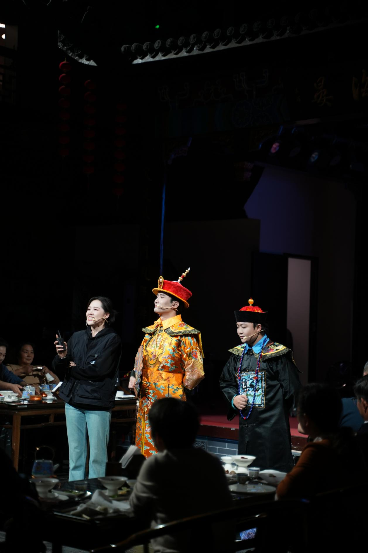 “未落座,已入画。”踏入场馆时,馓子小贩、糖葫芦老板、卖花郎身着古装穿行而过,叫卖声与原创歌曲《运河集市闹淮扬》交织。这处空间打破了传统剧场的观演边界,观众不再是旁观者,而是“剧中人、宴中客”。