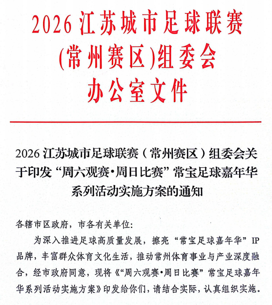 该模式以近日印发的《“周六观赛·周日比赛”常宝足球嘉年华系列活动实施方案》为蓝图,旨在以苏超联赛为引爆点、足球为纽带,通过文体旅深度融合,构建“周周有赛事、全城齐参与、全民共乐享”的城市体育消费新生态,从而将赛事流量高效转化为城市流量、产业增量与群众参与力,为城市发展注入全新动能。