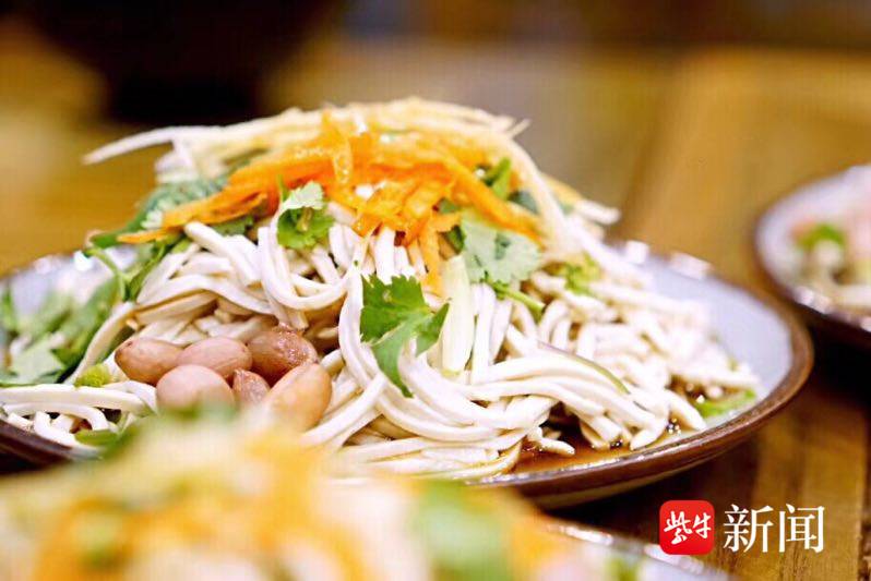 四代人的坚守,让海棠春的文脉与技艺从未断代。从曾祖父袁炎卿奠定根基,到第四代传承人袁海峻2016年毅然复业、2020年进驻泰州老街,家族始终以“守匠心、守本味”为家训。店内78岁的非遗传承人刘明喜专注切制干丝,薄如蝉翼;73岁的蒋广义师傅手工制作跳面,揉、醒、擀、跳一气呵成。干丝、跳面、麻饼、肴蹄、海棠春雨茶五项泰州非遗美食齐聚一堂,既凝聚着四代传承人的匠心,也承载着老泰州人的集体记忆。