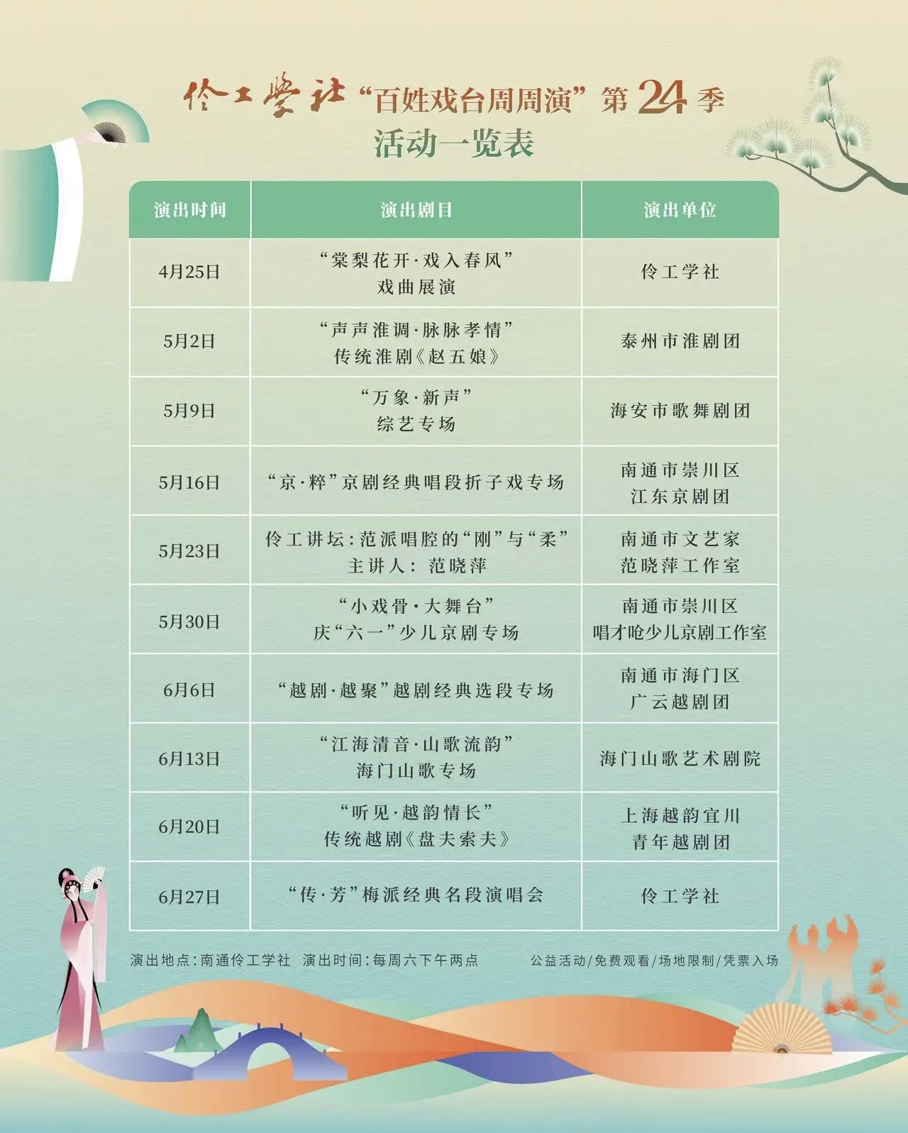 伶工学社“百姓戏台周周演”作为南通市文化馆的重磅惠民品牌,已连续举办二十四季,将传统戏曲文化送入百姓生活。本季共推出10场展演,持续至2026年6月,固定于每周六下午上演。暖心专属时段方便上班族、青少年等群体走近国粹,感受传统戏曲的独特魅力。