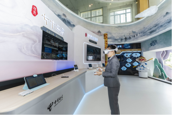 七十二变・智能娱乐体验区,满足全家多元化娱乐需求。这里有天翼智屏、VR体感设备、学习机等,依托电信5G云网能力,无需下载、即点即玩,老人看电视、年轻人健身娱乐、孩子学习互动,满足全家乐趣。