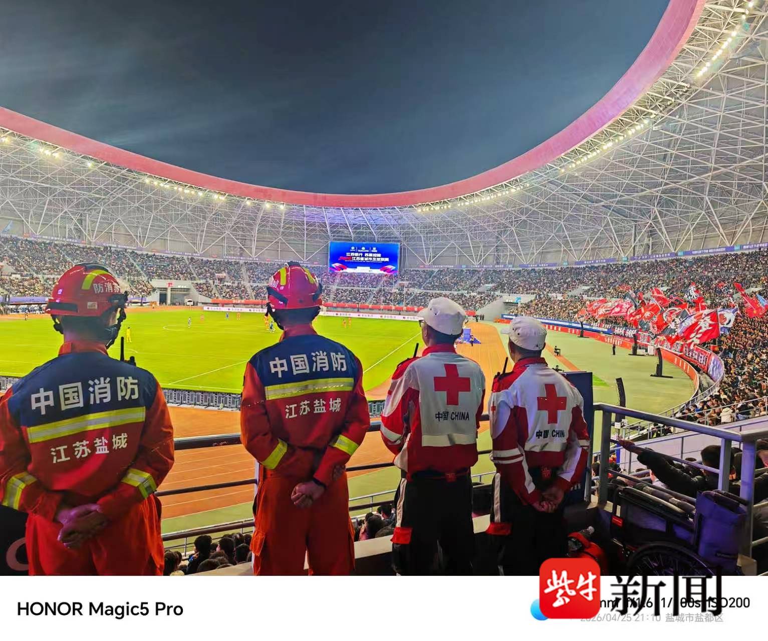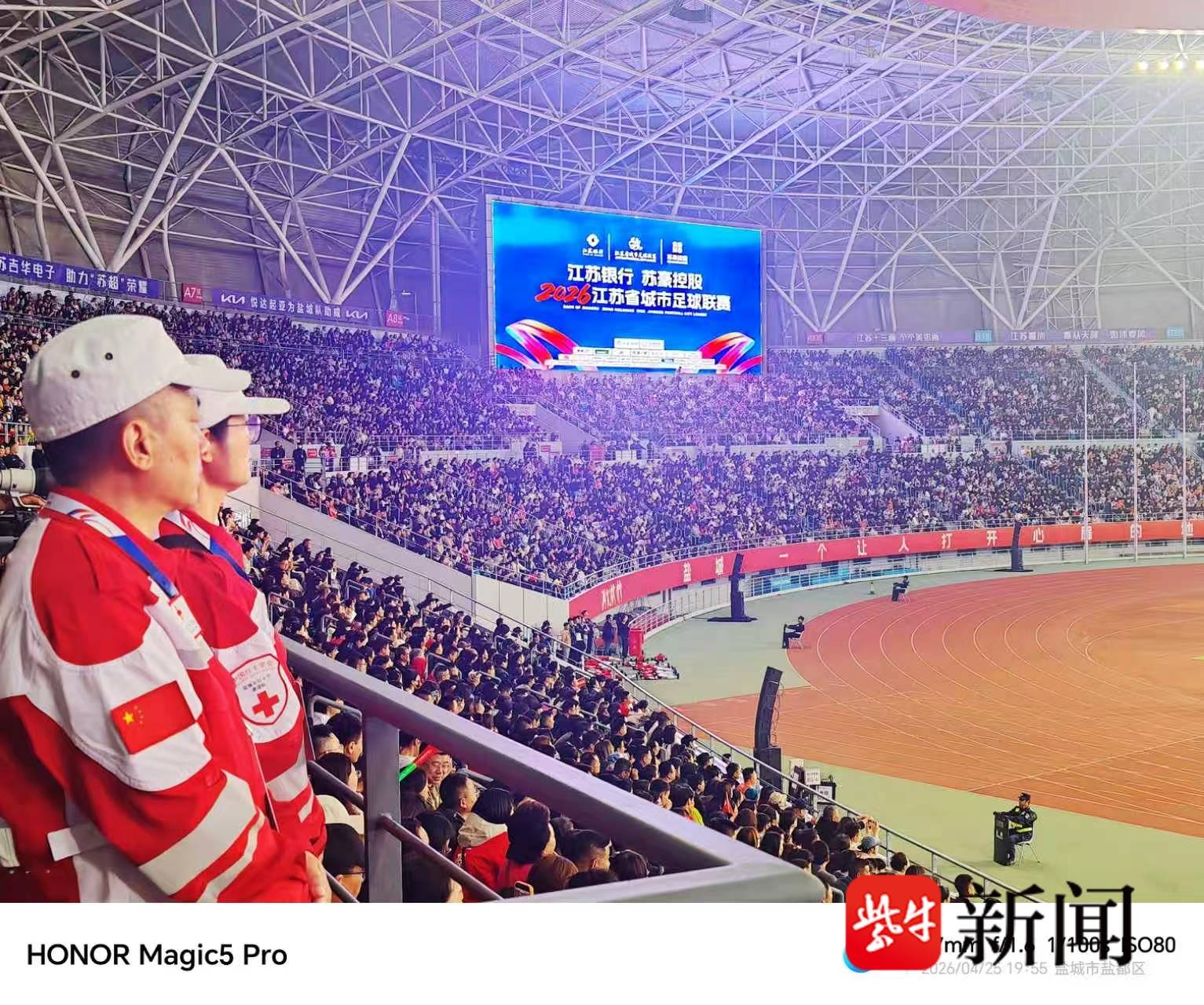 绿茵逐梦燃激情,人道守护暖赛场。2026年4月25日晚,2026年江苏省城市足球联赛常规赛第三轮焦点战在盐城奥体中心火热上演,盐城队主场迎战宿迁队,最终以1:0的比分力克对手,斩获关键一胜,33193名现场观众共同见证了这份荣耀与热血。赛场之上,盐城市红十字会志愿服务队挺身而出、全程坚守,以专业救护、贴心服务筑牢赛事安全防线,用责任与担当诠释红十字精神,赢得赛事组委会、参赛队伍及现场观众的一致赞誉。