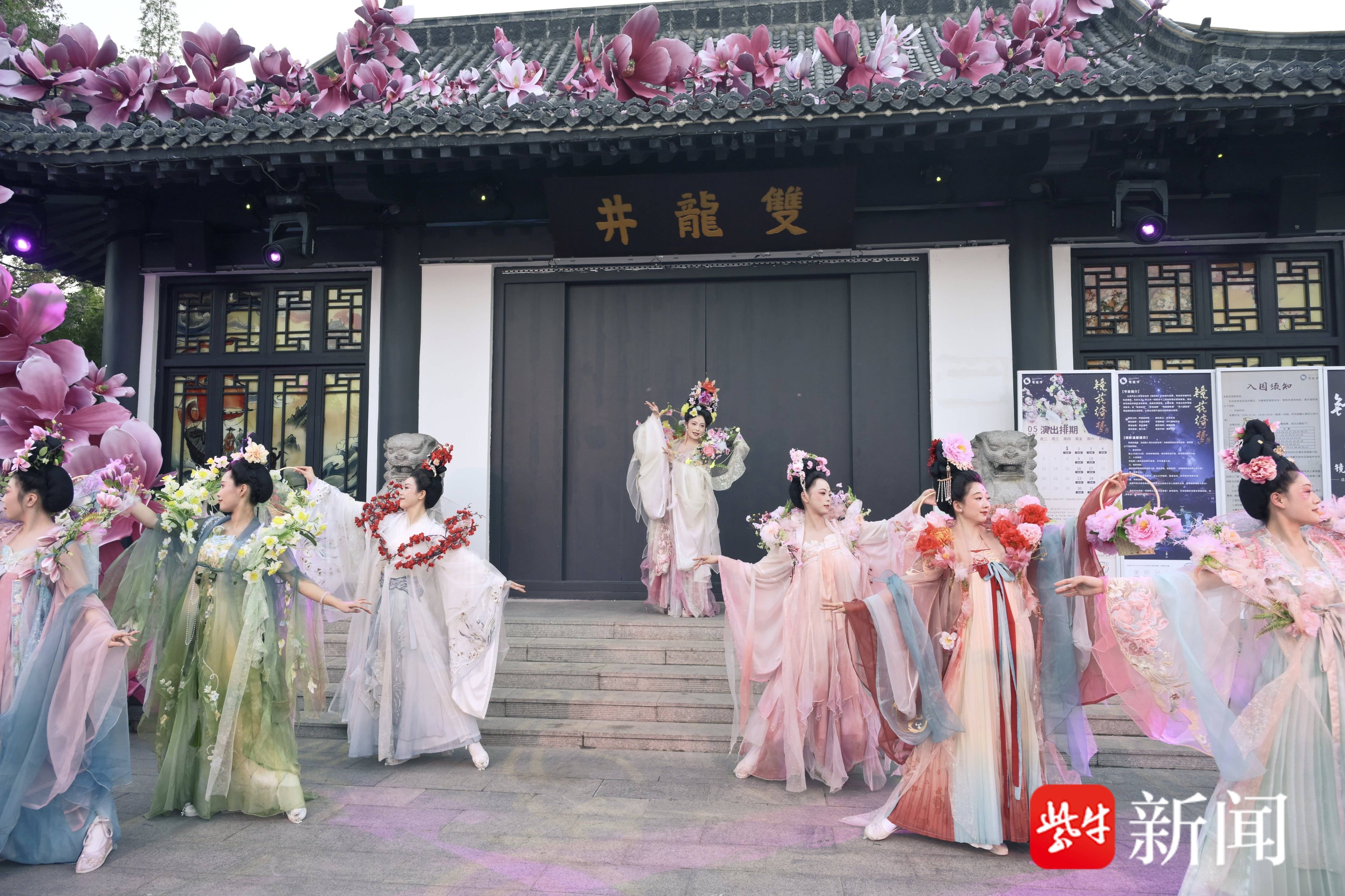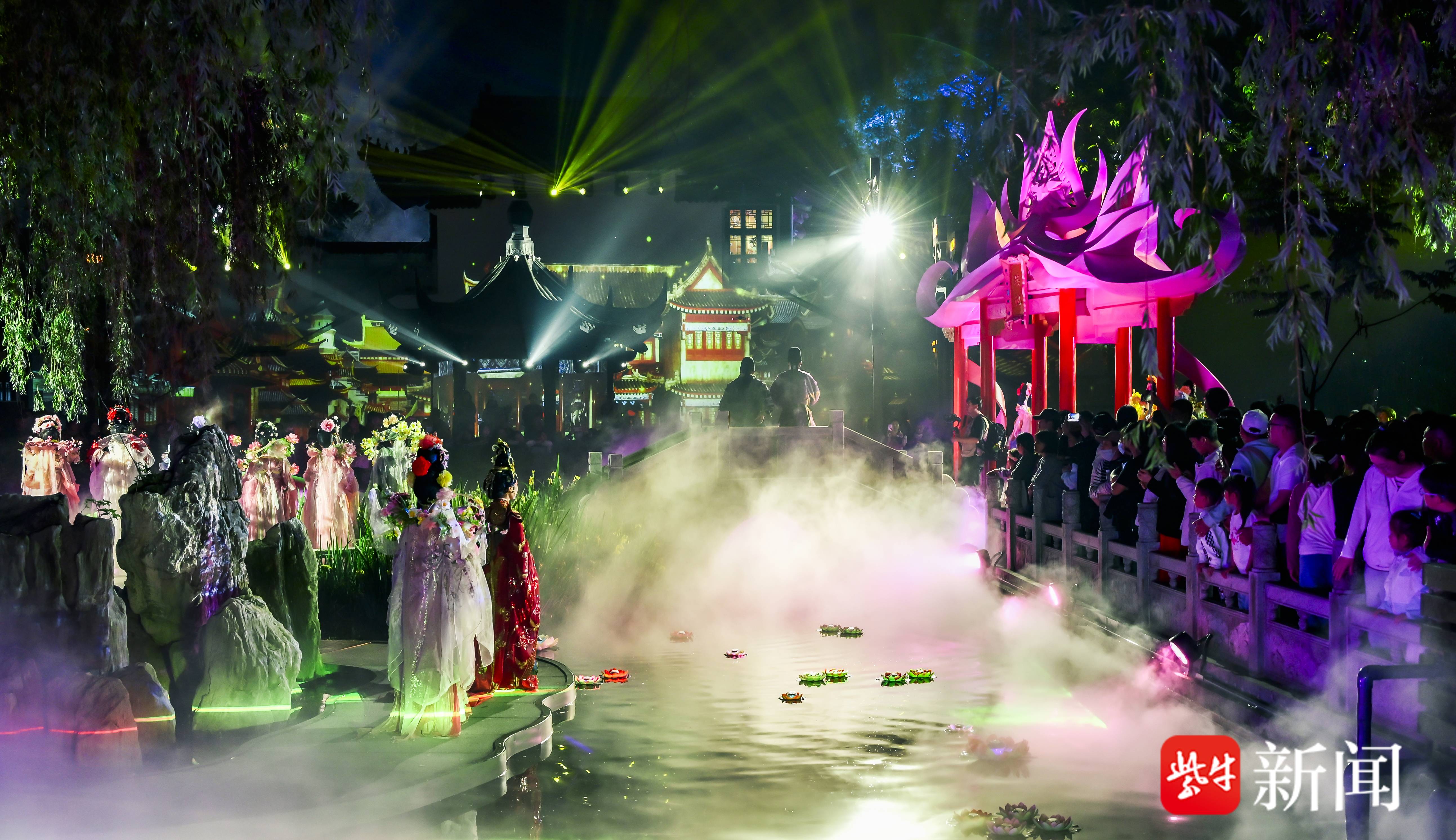 双龙井游园:传统互动与非遗演出相映成趣。 游园内设4个花车市集,汇聚《镜花缘》主题文创产品,古今交融、意趣盎然。品泉亭提供冷饮小吃,供游客随时小憩;茶馆推出季节限定茶饮,消费满50元即享12%优惠,引来众多茶友驻足品茗。身着古装的NPC带领游客参与投壶、摇骰子等传统互动游戏,让人们在欢声笑语中触摸传统文化脉搏。每日14:00至15:00,双龙井还上演淮海戏专场演出,国家级非物质文化遗产以婉转唱腔走进大众,传承地方戏曲艺术。
