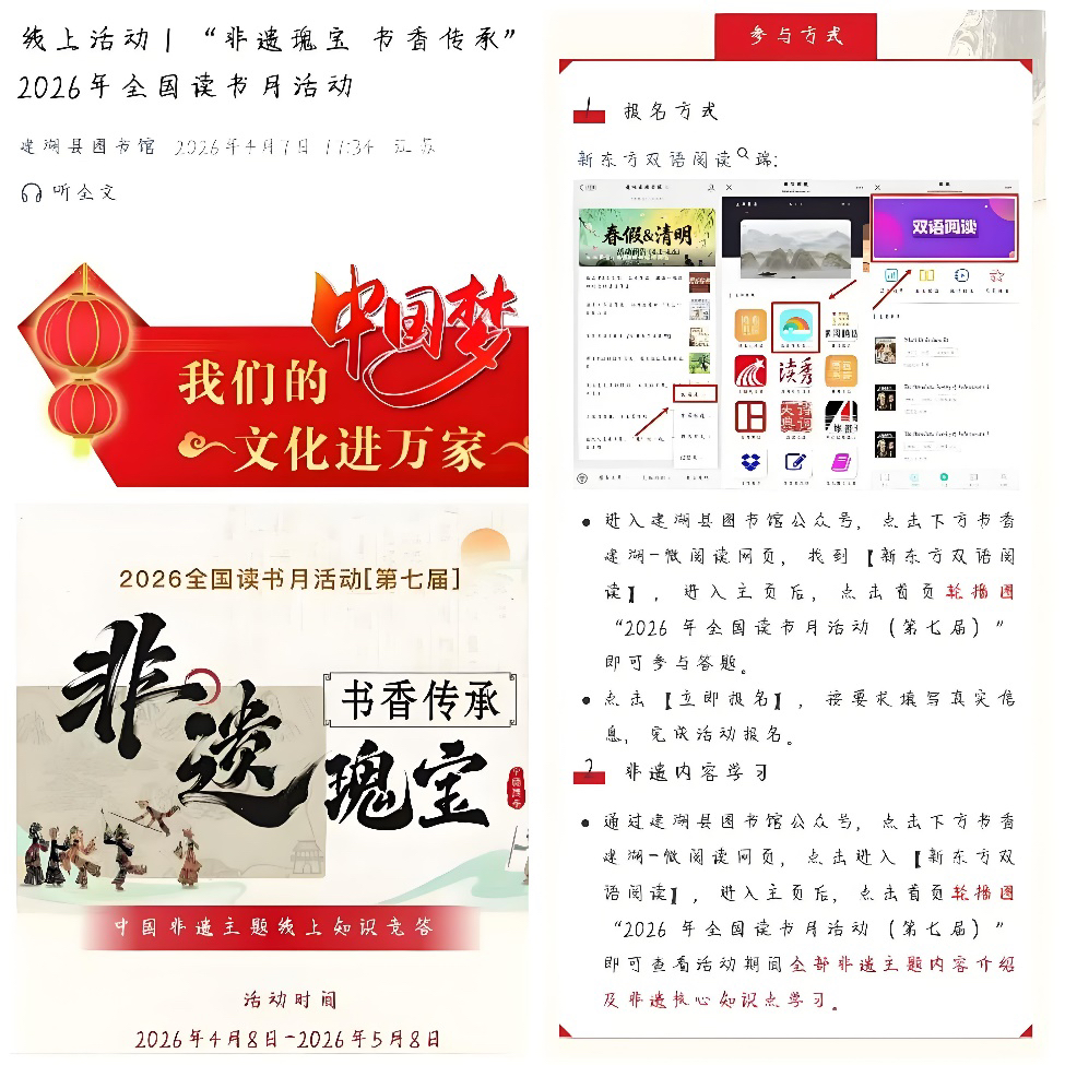 最是书香能致远。根据国务院批复,自2026年起,每年4月第四周为“全民阅读活动周”。紧扣这一全新契机,4月25日至30日,盐城市建湖县图书馆以“书香润湖城·阅读启新程”为主题,推出一系列多元阅读推广活动,通过线上线下联动、动静体验交融,全面点燃市民阅读热情,彰显新时代公共图书馆的服务效能与社会价值。
