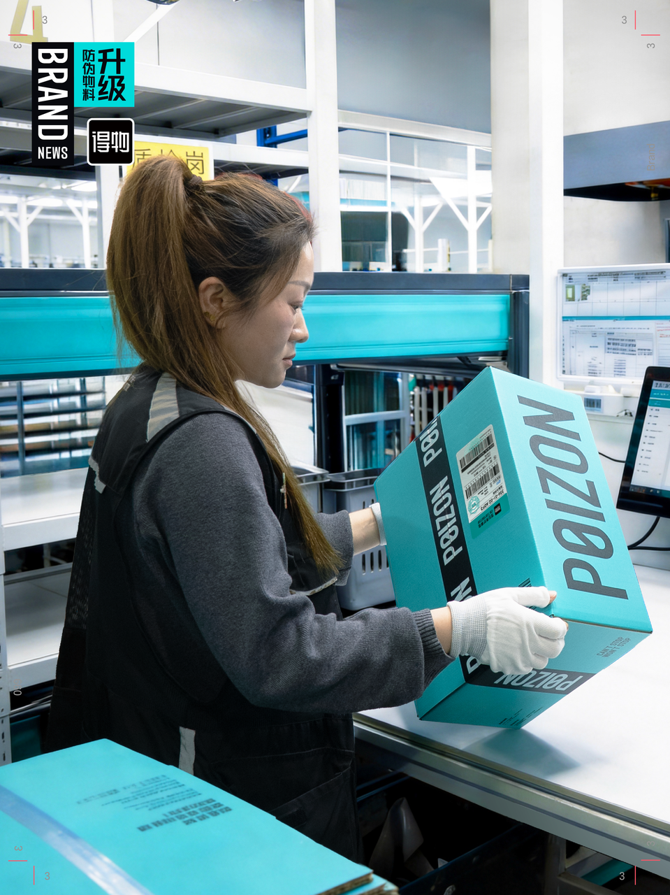 作为得物标志性视觉符号,极光蓝物流箱自 2020 年正式启用以来,已成为平台标准化配送的重要载体。依托多年市场实践与用户反馈,本次升级对箱体进行全方位优化。结合一线打包作业实际,工作人员优化箱体文字内容、重新校准溯源二维码功能,优化信息展示与分享体验;结合流水线操作动线调整尺码标签位置,有效提升仓储打包作业效率,缩短商品整体配送周期。