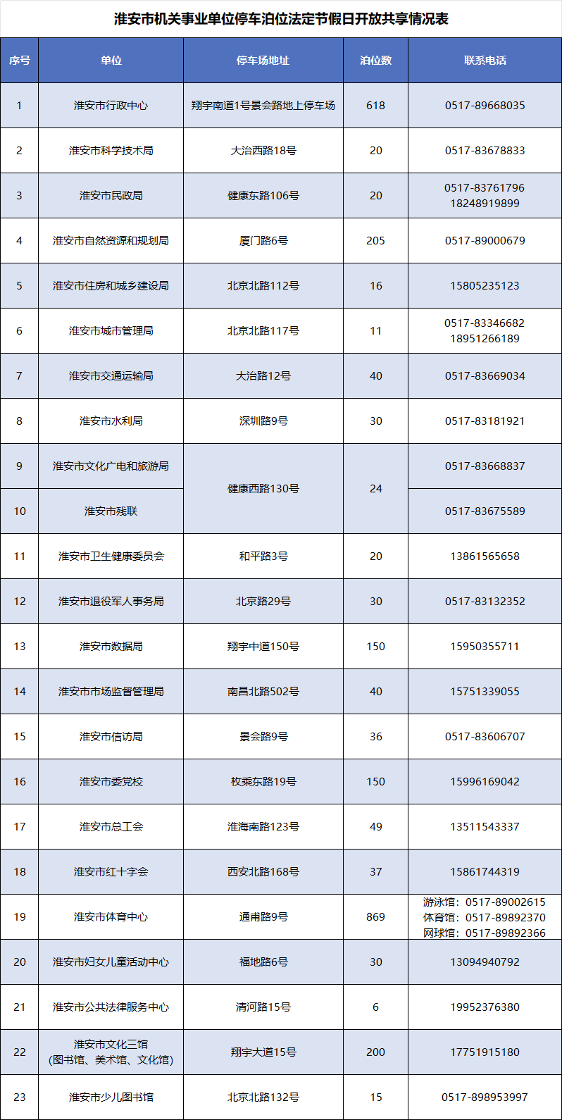 淮安市机关事业单位停车泊位法定节假日开放共享情况表