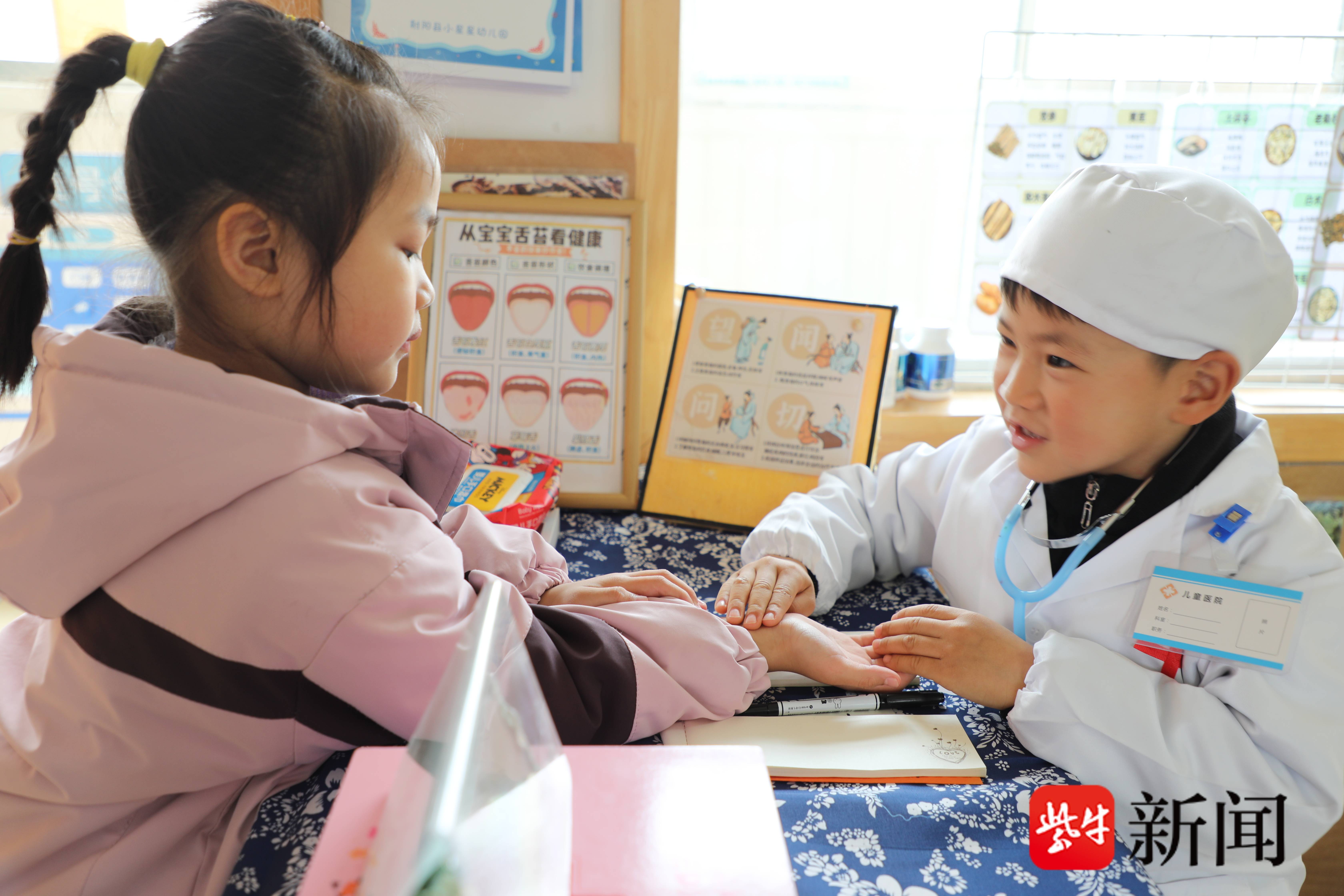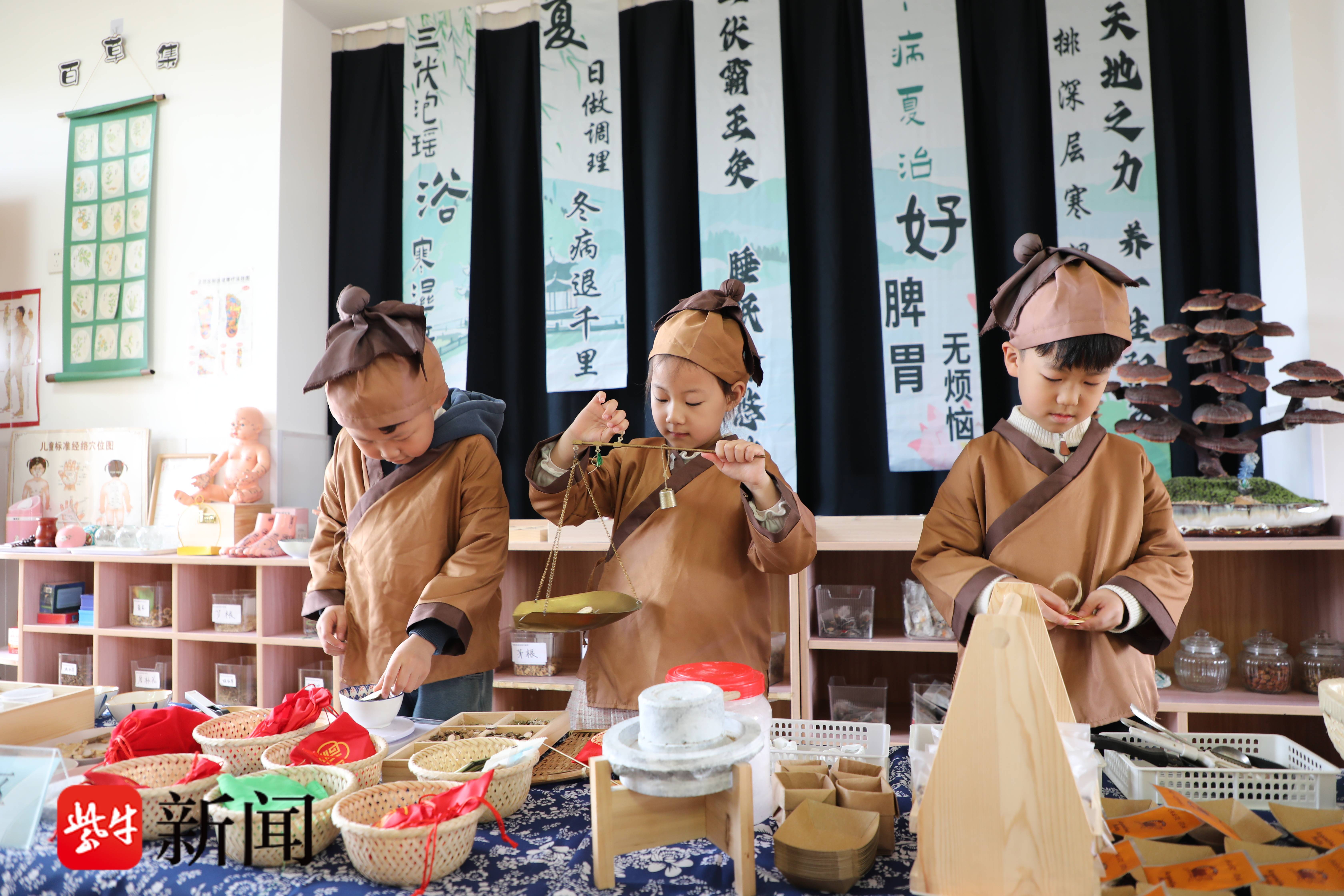 小小中医馆是射阳县小星星幼儿园非遗传承标志性项目。医馆内设有问诊、推拿针灸、养生等多个功能区域,陈列种类丰富的常见中药材。不同年龄阶段孩子在教师指导下,手工制作、角色扮演、趣味游戏轮番上阵,望、闻、问、切、开药方、称药、捣药、制药,像模像样,妙趣横生。“我们期望借助这种寓教于乐的创新方式,让孩子们在沉浸式的体验中真切感受中医药的独特魅力,让中医文化在幼儿园、在孩子们的心底扎根,激励孩子们将这份珍贵的文化瑰宝代代传承下去。”副园长朱福青表示。