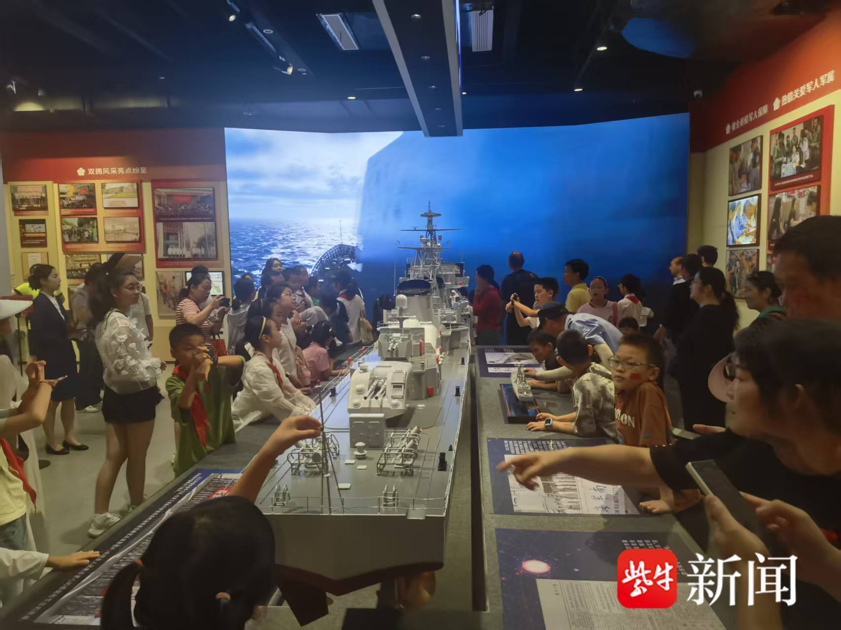 在南京国防园内,当天起试开放的南京双拥文化馆便迎来众多参观者,小朋友排着队玩起了模拟小推车,操作起电台发报机,回答着双拥和国防教育的问题,特别是围在近6米长的老南京舰模型面前充满好奇和羡慕,有的孩子表示长大了也要开军舰,看到《南京送喜官兵立功光荣榜》,有的孩子很自信地说,将来当兵了要立一等功,不少军人和退役军人或家人就是奔着双拥馆来的,其中就有几位特别的观众。
