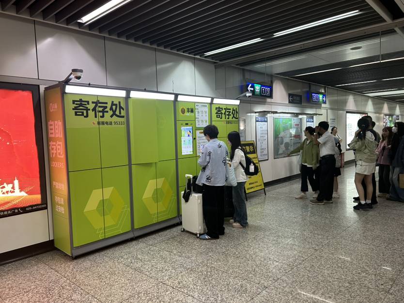 10月2日9:00,记者来到南京地铁2号线苜蓿园站,这里的客流熙熙攘攘,大部分都奔着通往陵园路、明孝陵博物馆的1号出口而去。不少人拖着巨大的行李箱,在一排写着“寄存处”字样的草绿色储物柜前驻足,然后掏出手机“扫一扫”开门,将行李箱、大背囊等放入其中,随后关门轻松离开。