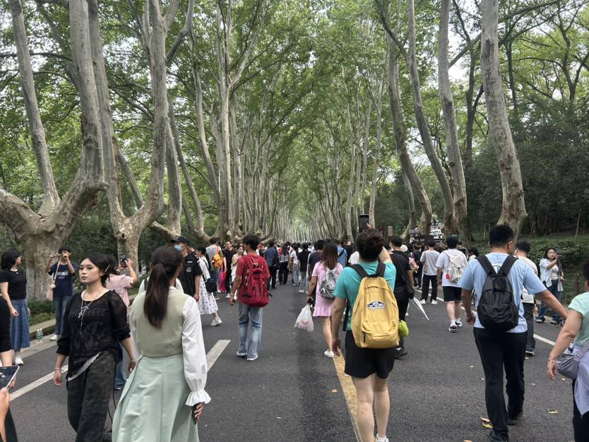 走出地铁站,记者看到,在沿途标识和警察、志愿者引导下,客流沿着陵园路步行道,向明孝陵方向有序行进。两侧郁郁葱葱的梧桐树,茂密的枝叶朝着天空伸展开来,在路面正上方形成了一个绿色的“穹顶”,将笼罩其下的陵园路变为一条阴凉而又绿意盎然的天然长廊,这便是网友们津津乐道的网红打卡点“梧桐大道”。众多游人在路中间,或是两侧的树下各自寻找美景驻足拍摄。