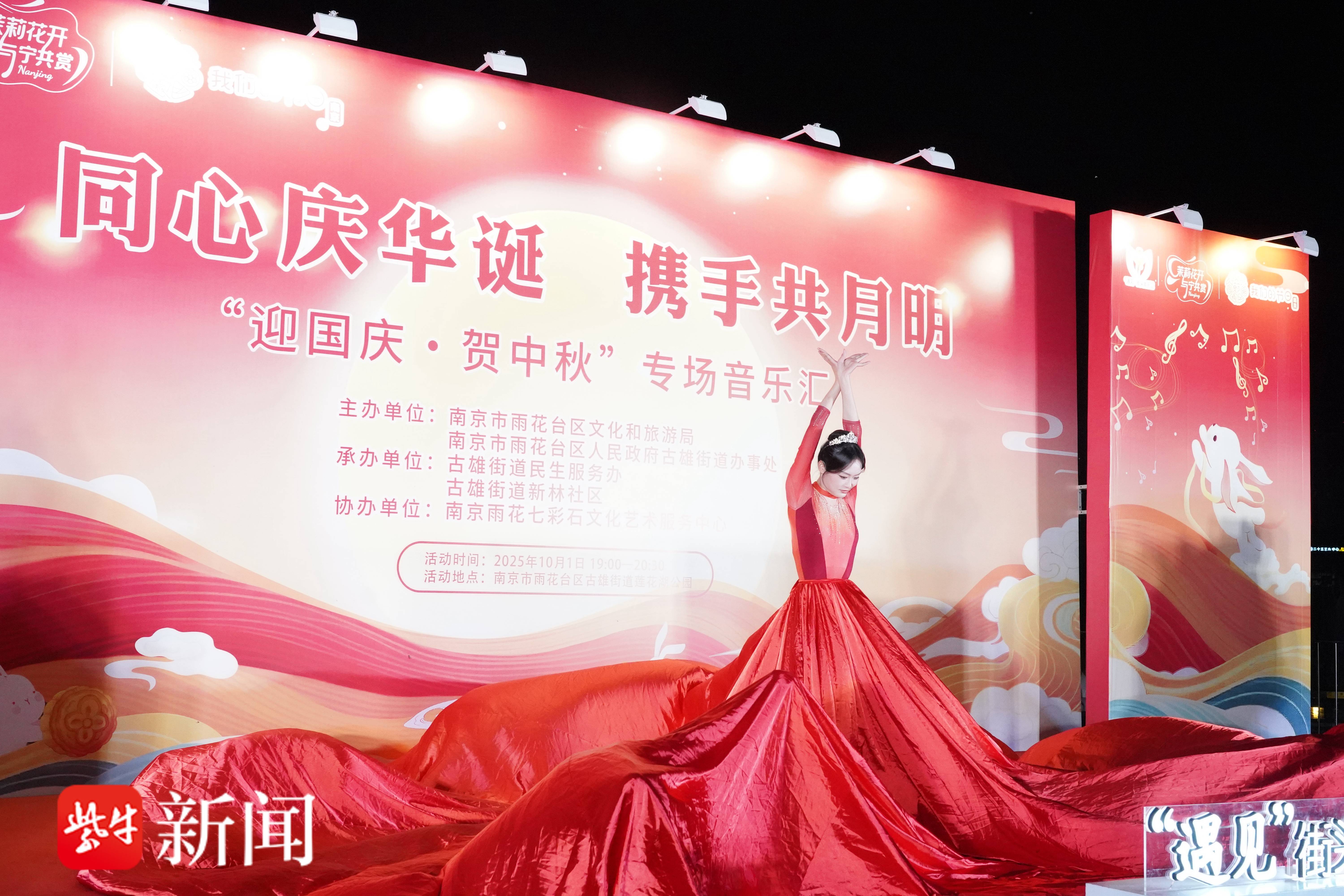 本次音乐汇由南京市雨花台区文化和旅游局、南京市雨花台区人民政府古雄街道办事处联合主办。现场灯光璀璨,百余名观众齐聚一堂,在歌舞、民乐、变脸等多元艺术形式的演绎中,共庆新中国华诞、同享中秋佳节的温馨与喜悦。演出在舞蹈《红日东升》中拉开帷幕。演员们以矫健的舞姿、饱满的热情,生动展现了东方巨龙苏醒的磅礴气势。随后,《今天是你的生日》《铭记》《我和我的祖国》等歌曲深情唱响,歌手将赤子之情融入音符,引发全场观众的情感共鸣。非遗技艺变脸《千面生趣》惊艳亮相,小演员化身“变脸精灵”,手眼身法间,数十张色彩绚丽的脸谱瞬间切换让观众目不暇接,掌声与欢呼声此起彼伏;朗诵《中国红》以铿锵有力的语言,讲述“中国红”背后的历史与担当,唤起观众对民族文化的自豪与认同。