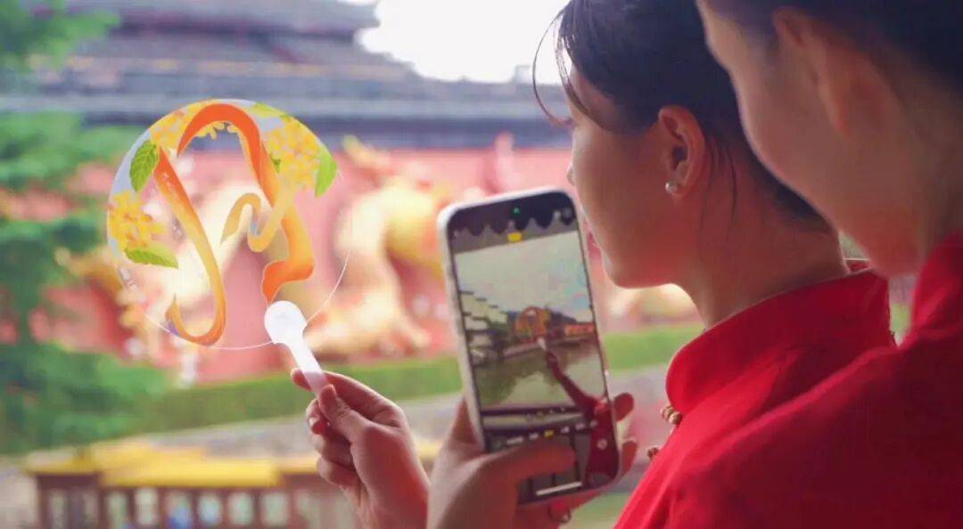 在夫子庙大成殿前、文德桥畔、科举博物馆明远楼前等秦淮的“最美赏月地”,随处可见手持团扇拍照的游客。有人将团扇举至桥头,让扇面透卡与真实月色重叠,拍出“诗画合一”的意境;有亲子家庭带着孩子寻找扇面上诗句对应的景点,边打卡边讲解诗词。