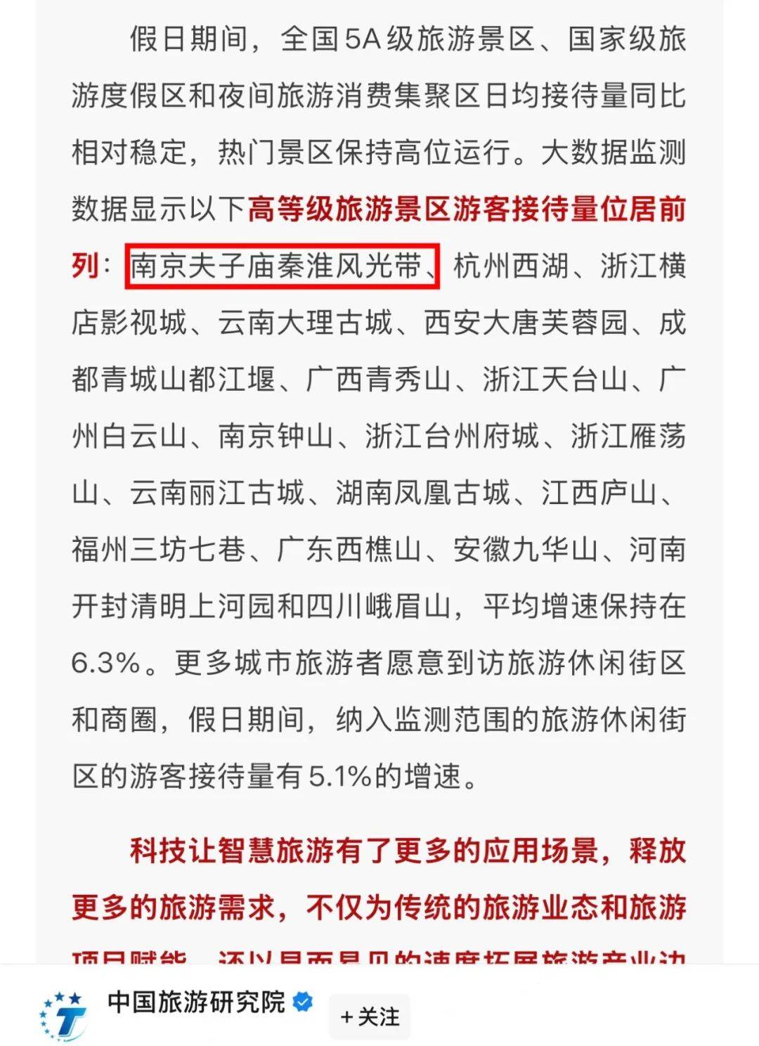 2025年国庆假期,夫子庙大景区总客流293.1万人。其中夫子庙景区229.9万人,门东景区63.2万人。根据“中国旅游研究院”特别评论文章显示,在全国高等级旅游景区游客接待量排名中,南京夫子庙秦淮风光带位列第一。这是继今年春节、五一假期后,南京夫子庙秦淮风光带在全国高等级旅游景区游客接待量排名中第三次位列第一。
