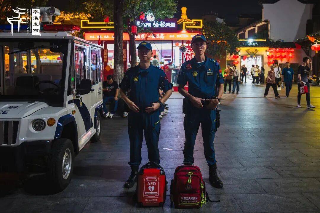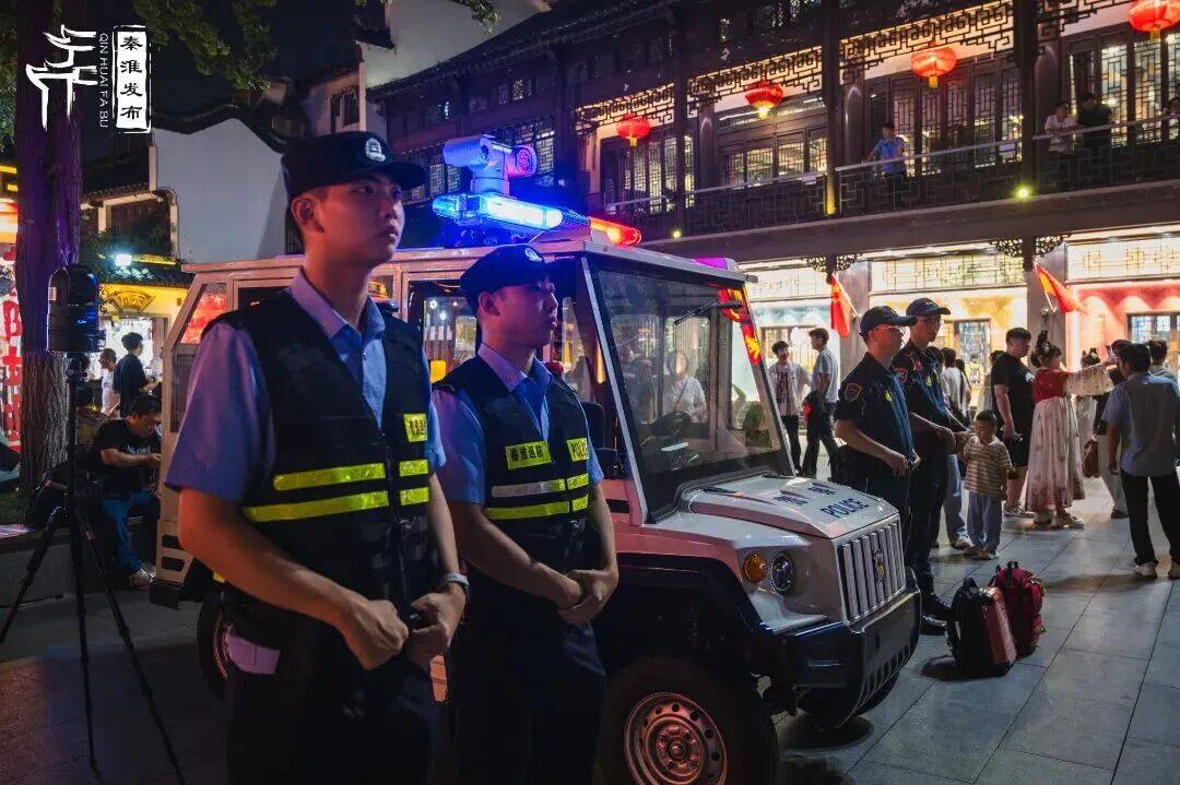黄金周期间夫子庙景区内,公安、武警、城管、环卫、市监等多部门工作人员全天候值守,维护景区安全有序、道路洁净,营造了安全、安心、舒适的游览环境。