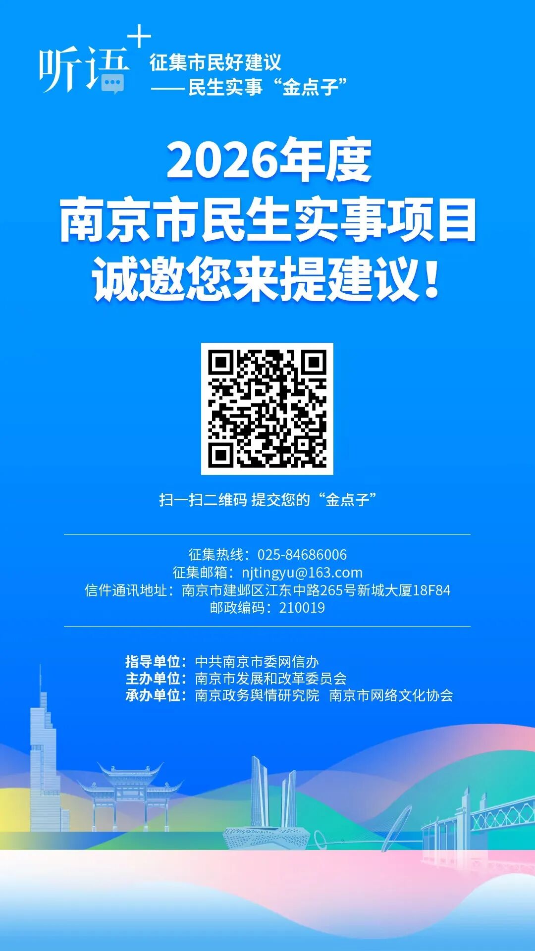 即日起至10月25日,广大市民网友可围绕就业创业、三育支持、养老服务、扶弱济困、医疗健康、文旅体育、住有宜居、交通出行、环境提升等民生领域,就当下市民群众关心关切的急难愁盼积极建言献策。除了扫码进入“听语+”平台留言外,市民网友还可通过热线电话025-84686006(工作日9:30—12:00;14:00—17:30),电子邮件发送至njtingyu@163.com,以及投递信件(南京市建邺区江东中路265号新城大厦18F84,邮编210019)等形式参与征集活动。每一个“金点子”,都是南京民生改善的“指南针”。