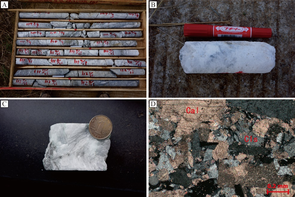 麻山头锶矿区天青石矿石照片(A,B,C—矿石照片,D—镜下照片,Cal—方解石,Cls—天青石)