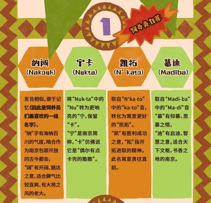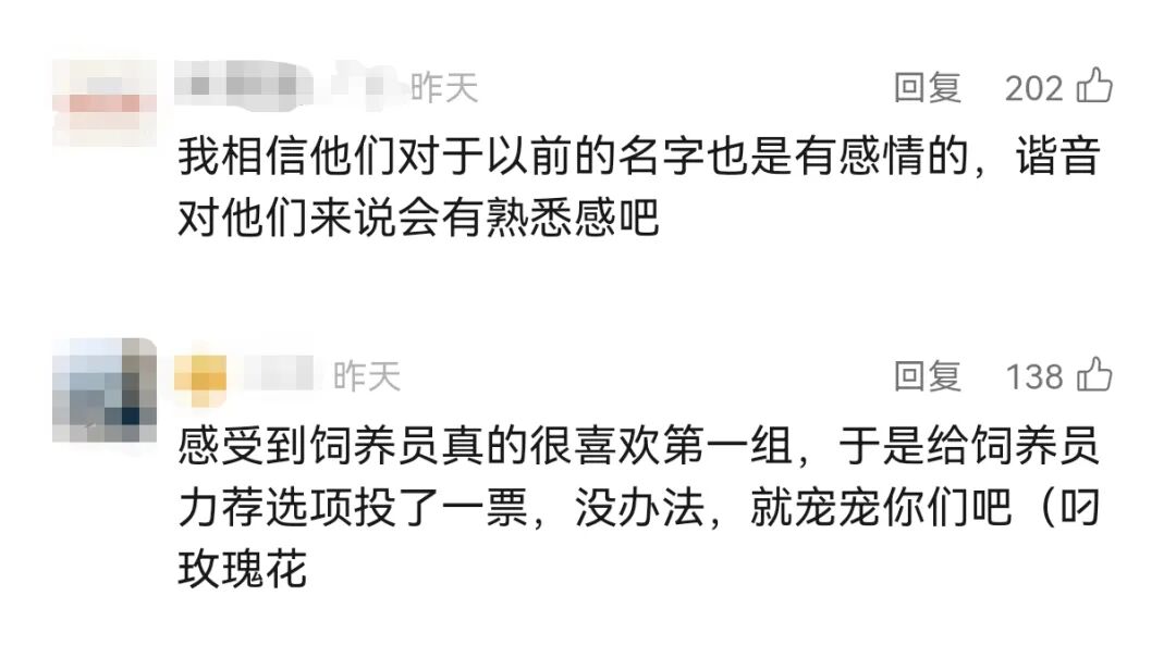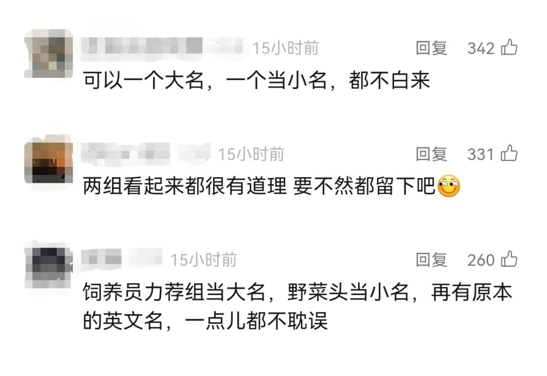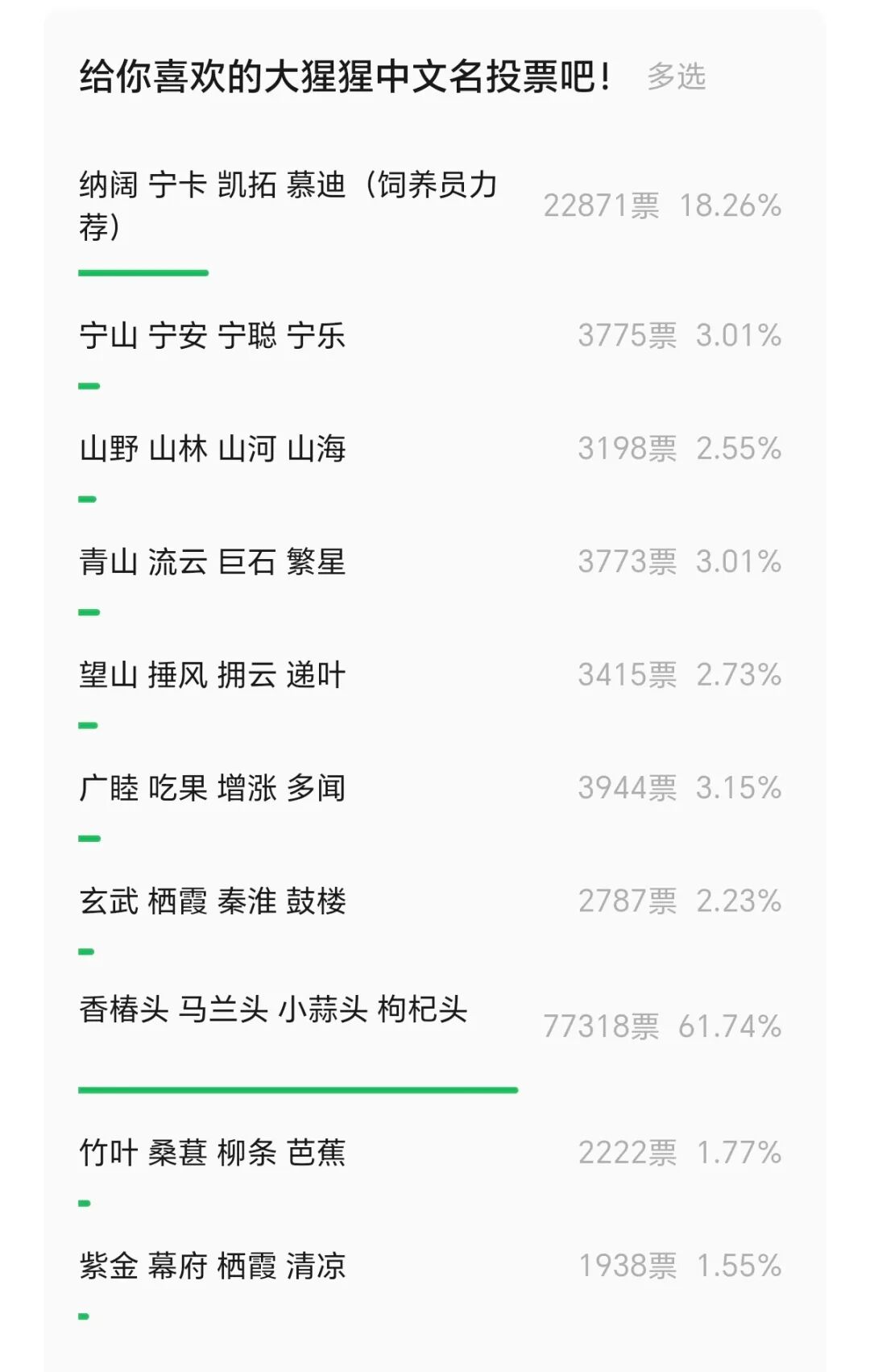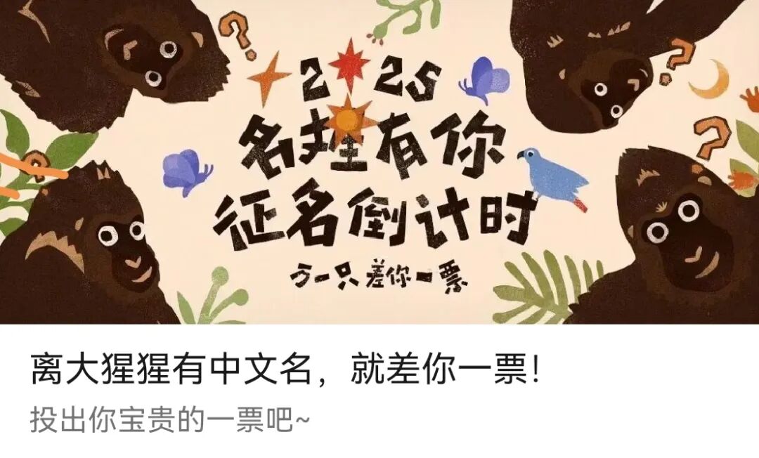 而另一个,就是带着“饲养员力荐”光环的选手:“纳阔、宁卡、凯拓、慕迪”,这一组不仅字面寓意好,还是大猩猩原名的音译。在饲养员的大力宣传下,“音译组”也获得了很多网友的支持,目前排名第二。