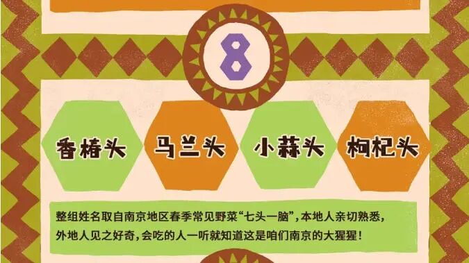 第一个是7万+票数的“野菜组”:“香椿头、马兰头、小蒜头、枸杞头”。这一组取自南京地区春季必吃野菜,“野菜天团”凭借亲切感和烟火气,被“抬上桌”,暂时排第一,支持者称之为“头字辈”“四巨头”。