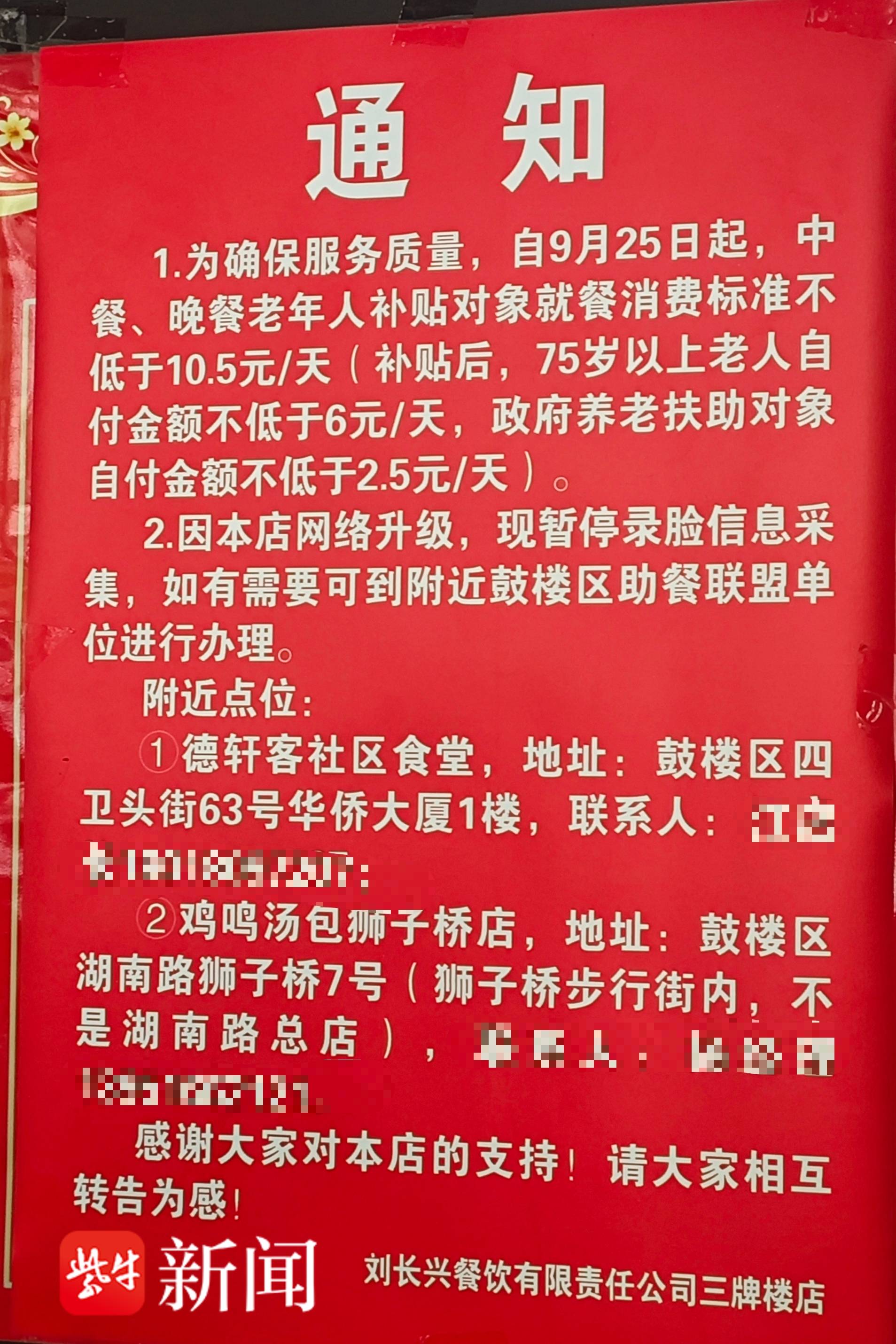 记者从店门上看到一则通知。上面写道:自9月25日起,中餐、晚餐老年人补贴对象就餐消费标准不低于10.5元/天(补贴后,75岁以上老人自付金额不低于6元/天,政府养老扶助对象自付金额不低于2.5元/天)。通知还提到,因本店网络升级,现暂停录脸信息采集,如有需要可到附近鼓楼区助餐联盟单位进行办理。
