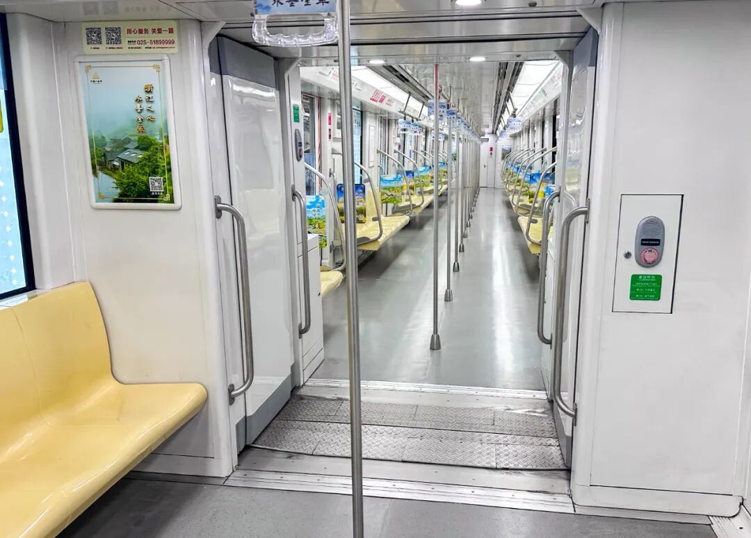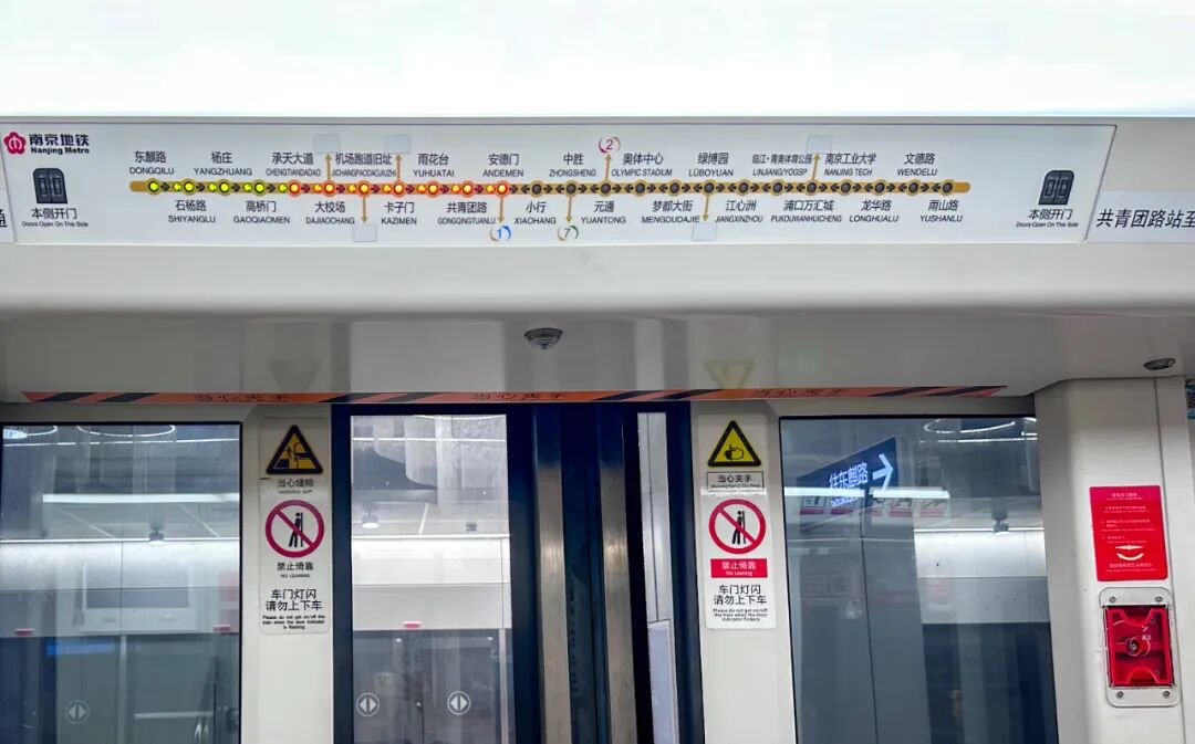 没过多久,一阵清脆的到站提示音响起,列车平稳驶入卡子门站,车门自动开启。可以注意到,车门上方的闪灯图上,“安德门至东麒路”沿线站点的显示灯已全部亮起,直观呈现出10号线二期的线路走向。