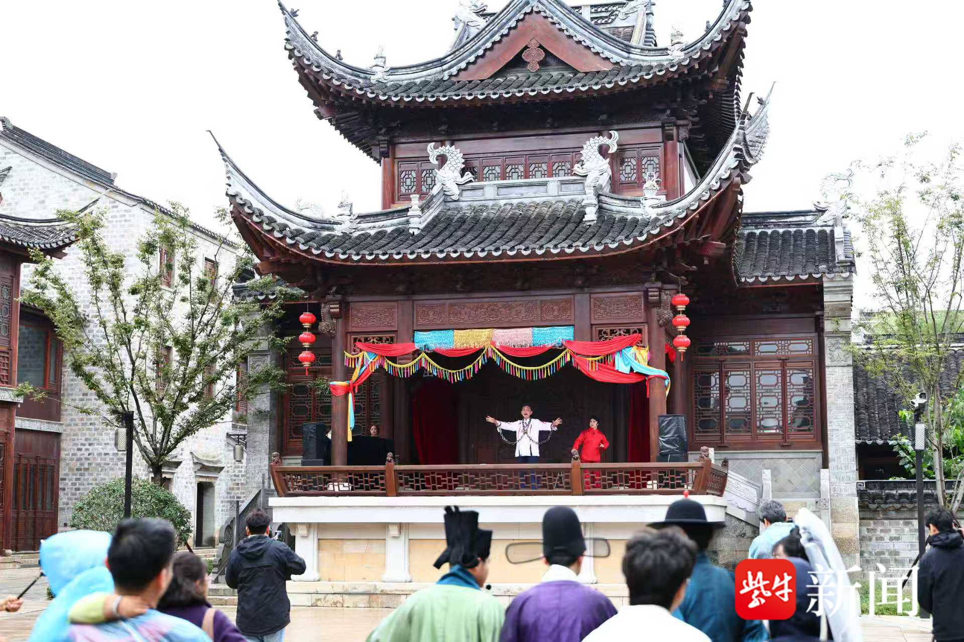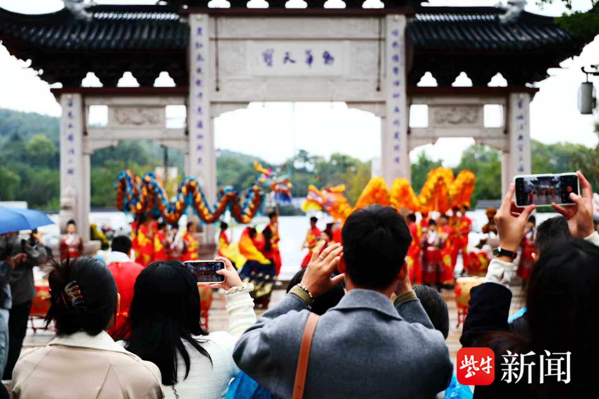 10月19日当天,“江山入戏”系列活动的亮点玩法“全城有戏”之一——“全民派对”在栖霞古镇上演。剧本游场景演绎、舞蹈、民乐表演等环节游客掌声不断。南京理工大学紫金学院的同学们的舞龙表演,青春活力尽显;古镇北区戏台处,栖霞区戏曲曲艺家协会的戏曲演出也为今天的活动添上浓墨重彩的一笔。