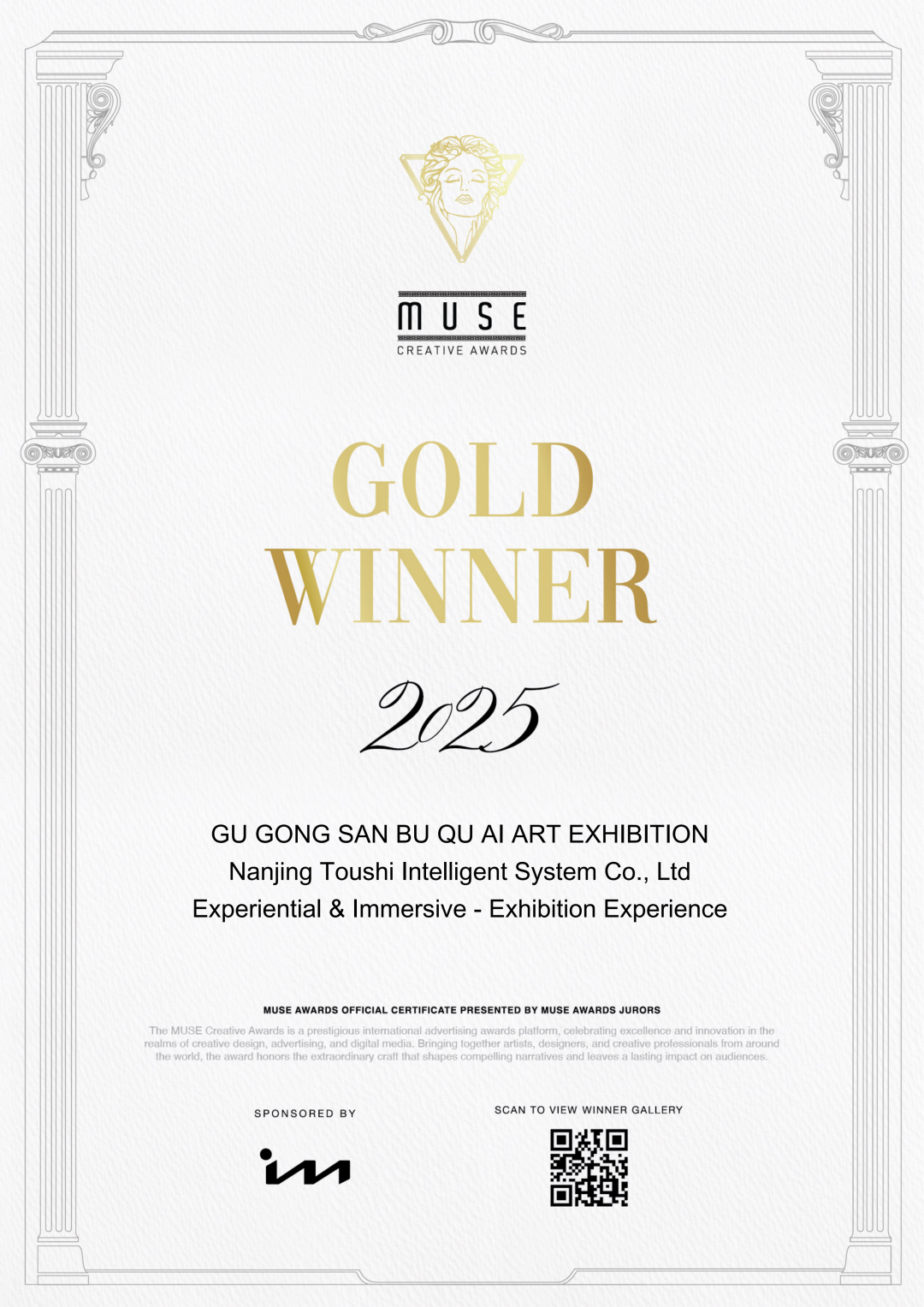 ○近日,南京投石智能系统有限公司主办的《故宫三部曲》人工智能艺术大展,荣获2025年缪斯设计奖沉浸式体验类奖项金奖。