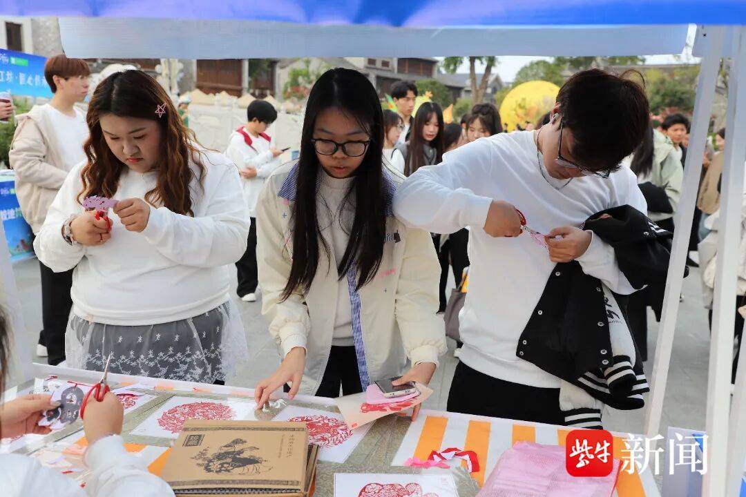 民间布艺体验区,“苏超”主题作品引人注目,学生们则在老师的带领下,将现代设计理念融入传统编织技艺,创作出兼具传统韵味与现代审美的饰品。在剪纸工坊,游客们在老师的指导下拿起剪刀,亲身体验“工匠精神” 在指尖的流转。抖空竹展演区更是欢声不断,00后的大学生们努力练习想掌握空竹技巧,80后中年游客则兴致勃勃地滚起铁环。