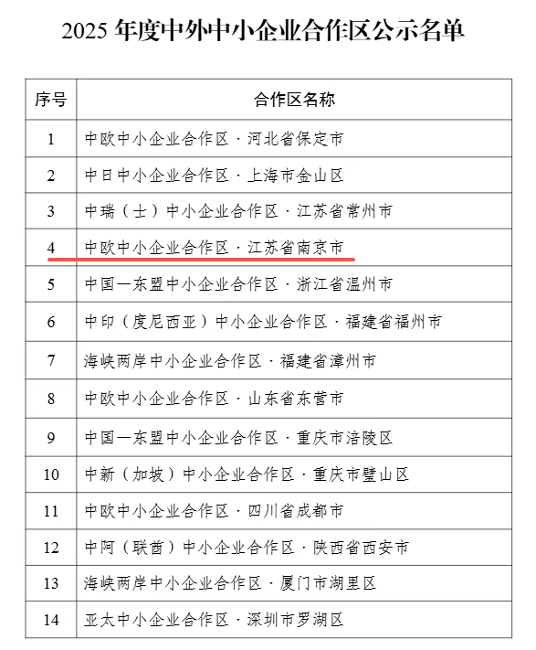 此次是工信部2024年正式出台《中外中小企业合作区管理暂行办法》之后首次组织申报和评选。下一步,南京将加大统筹力度,充分利用好国家中外中小企业合作区政策资源,更好地支持中小企业用好两个市场、两种资源,促进中小企业高质量发展。