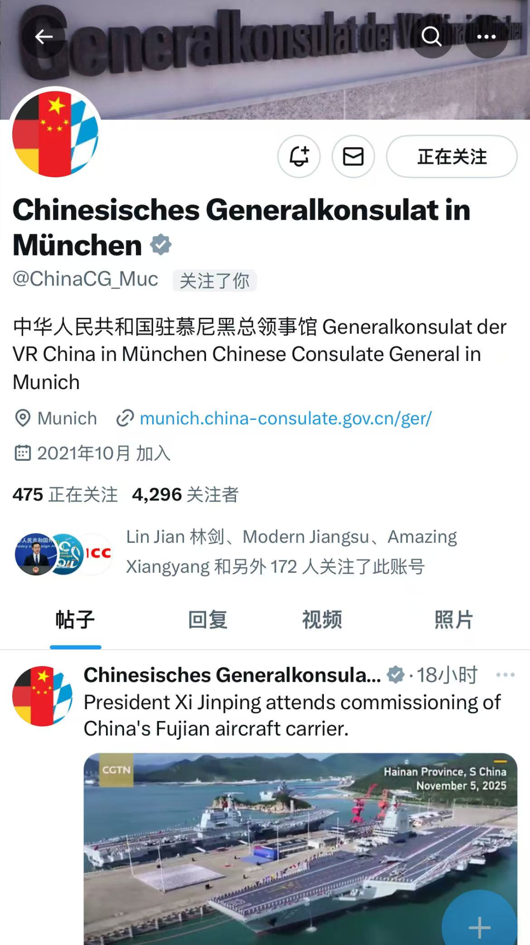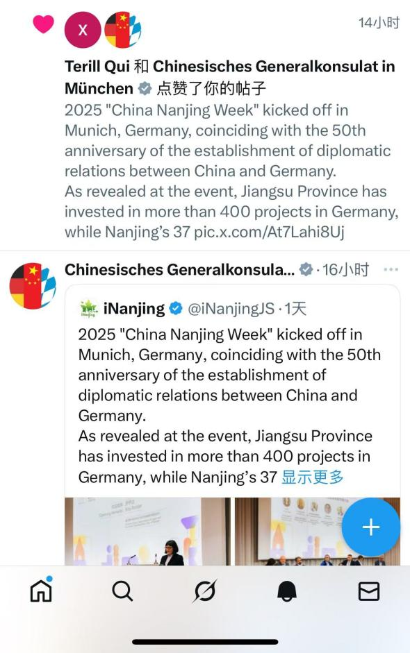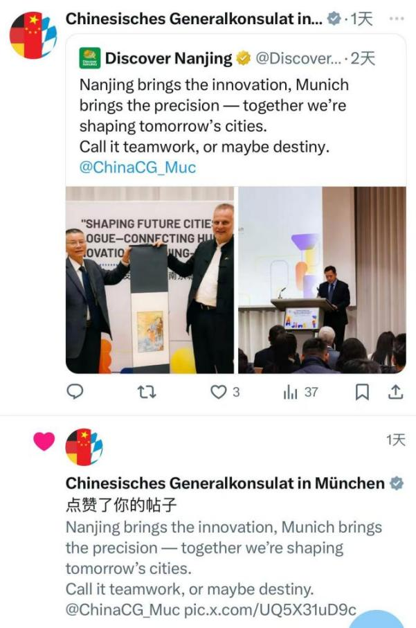 中国驻慕尼黑总领事馆点赞并转发南京海外账号帖文。