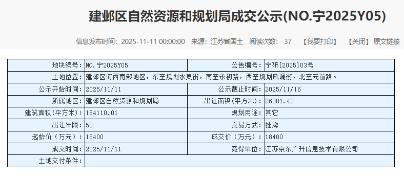 扬子晚报网11月11日讯(记者 王夕悦)1.84亿元成功摘地,京东将与阿里、小米做邻居!11月11日,京东集团成功竞得建邺区NO.宁2025Y05地块,京东集团南京研发中心正式落户建邺高新区。
