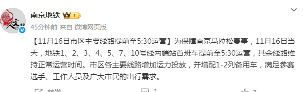为保障南京马拉松赛事,11月16日当天,地铁1、2、3、4、5、7、10号线两端站首班车提前至5:30运营,其余线路维持正常运营时间。市区各主要线路增加运力投放,并增配1-2列备用车,满足参赛选手、工作人员及广大市民的出行需求。