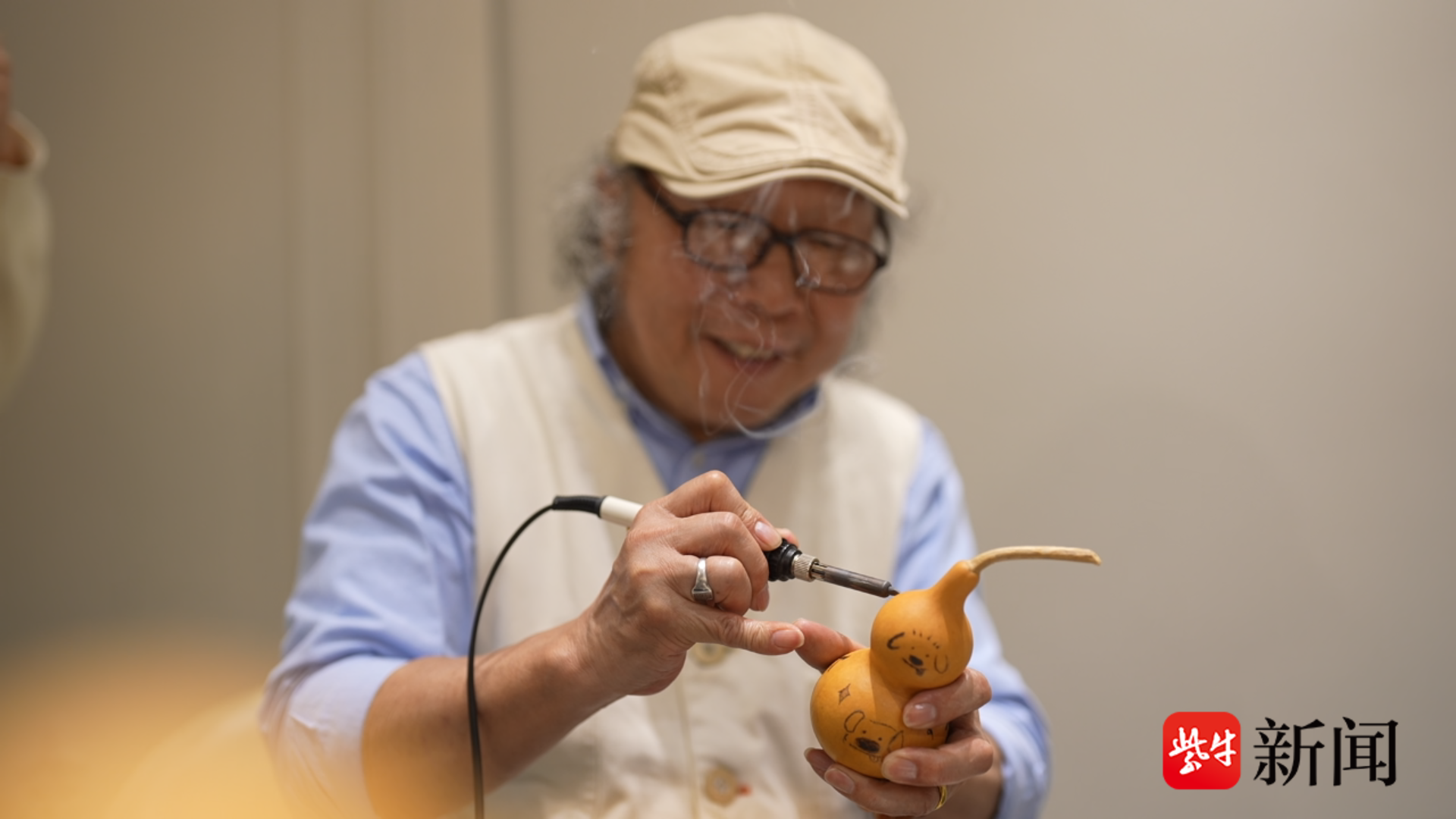 “烙画这事儿,说起来早啦。”王高飞一边在葫芦上烙画,一边向记者讲述童年与烙画的初遇。他回忆道,最早在秦淮区三山街一家琴行橱窗里,看见一把琴上的图案,“不是刻的,也不是画的,是火烧的”。随着年岁增长,他渐渐明白那便是“烙画”。他也利用家中的生活用具进行创作,烧热的炉钩子、火钳子都成了他最早的创作工具。