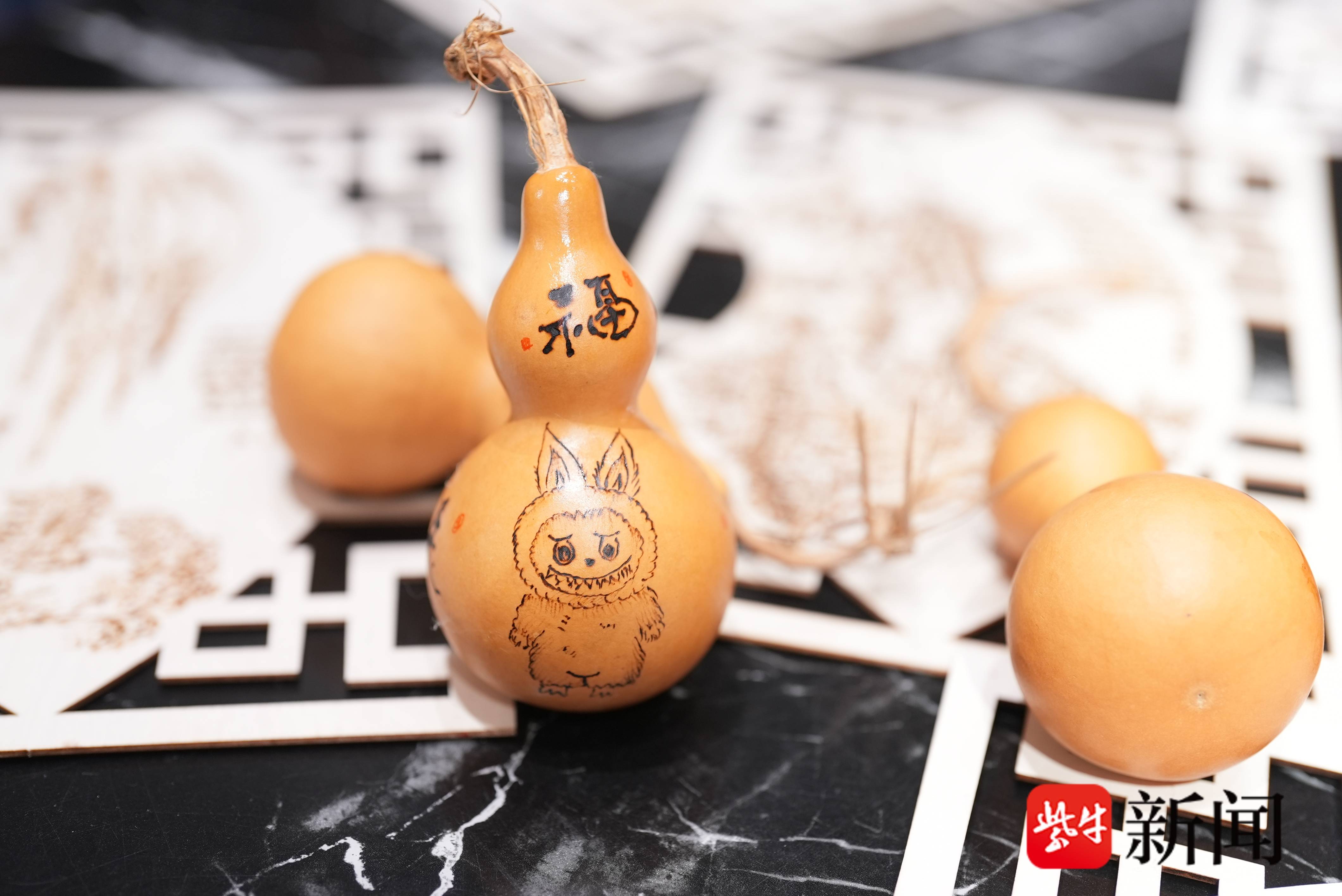 四十年如一日,电烙笔在他手中游走于万千材料之上。那缕缕白烟与无数烫痕,早已成为王高飞艺术生命里最寻常的注脚。他笑着说:“熟悉的题材,几分钟就能烙成。”话音刚落,在学员的请教下,他便现场演示:电烙笔如毛笔般游走,温度与力度精准配合,不过五分钟,一个活灵活现的“拉布布”图案便在葫芦上“诞生”。学员们围拢过来,惊叹于传统技艺与潮流形象竟能如此交融。