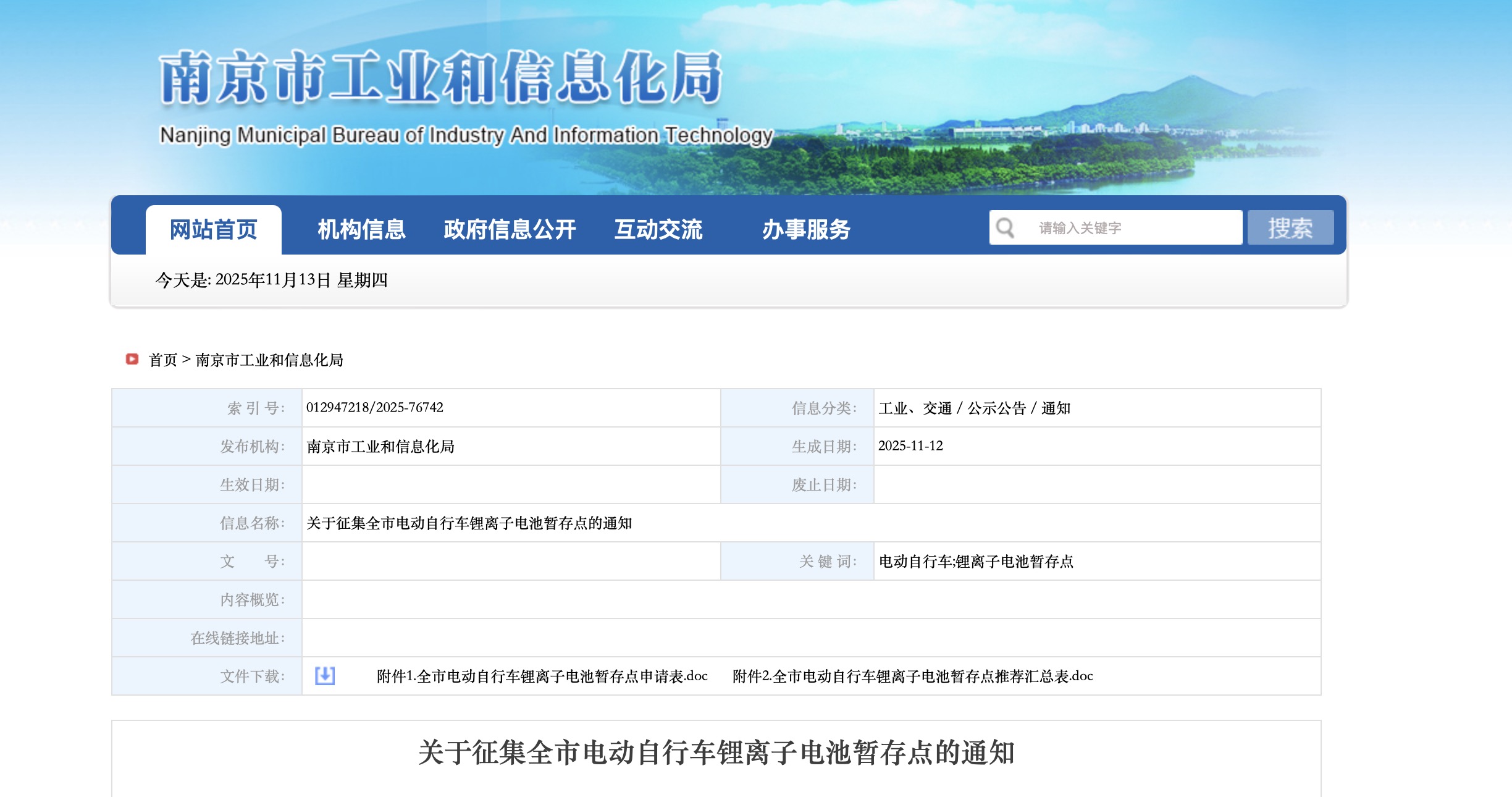 为进一步加强全市电动自行车锂离子电池回收利用体系建设,推动电动自行车锂离子电池回收利用管理,规范行业发展,根据全国电动自行车安全隐患全链条整治工作专班《电动自行车锂离子电池回收利用体系建设指南实施细则》文件要求和江苏省工信厅的工作部署,现公开征集南京市电动自行车锂离子电池暂存点。