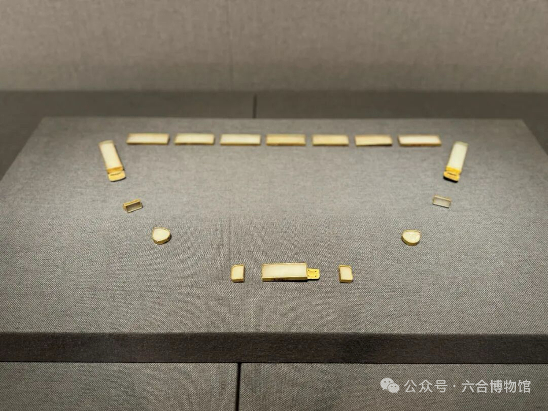 再如板仓徐钦墓出土的金镶玉带,共十六块,带板托均以黄金制成,插销、带扣亦为金质。金托上镶嵌白玉带板,玉质温润纯白,毫无瑕疵,实属难得之佳品。