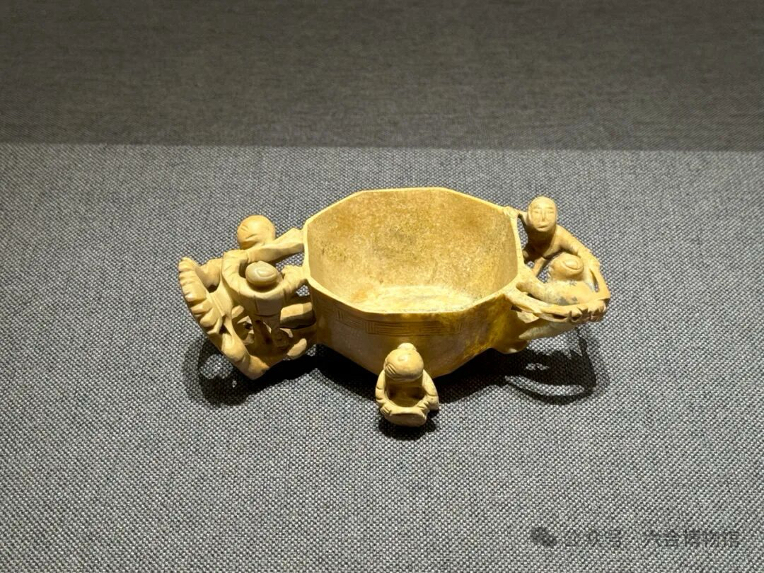展览中的玉器精品例如明墓出土的明圆雕婴戏八角形玉杯。该杯为青玉质。杯体为八边形,两侧各雕两个童子和松树为把手,童子相对而视,一手抓住杯沿,另一手搭在树上作攀爬状。杯壁外亦雕一童子,双腿分开作跪地状,手中提一竹篮,该玉器展现了明代玉器的“粗大明”风格。