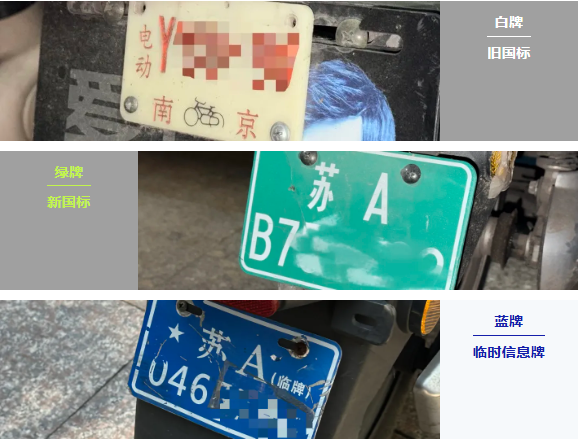 当前,南京市路面上行驶的本地电动两轮车牌照有“白、绿、蓝”三种,分别对应“旧国标、新国标、临时信息牌”三类车辆登记信息。