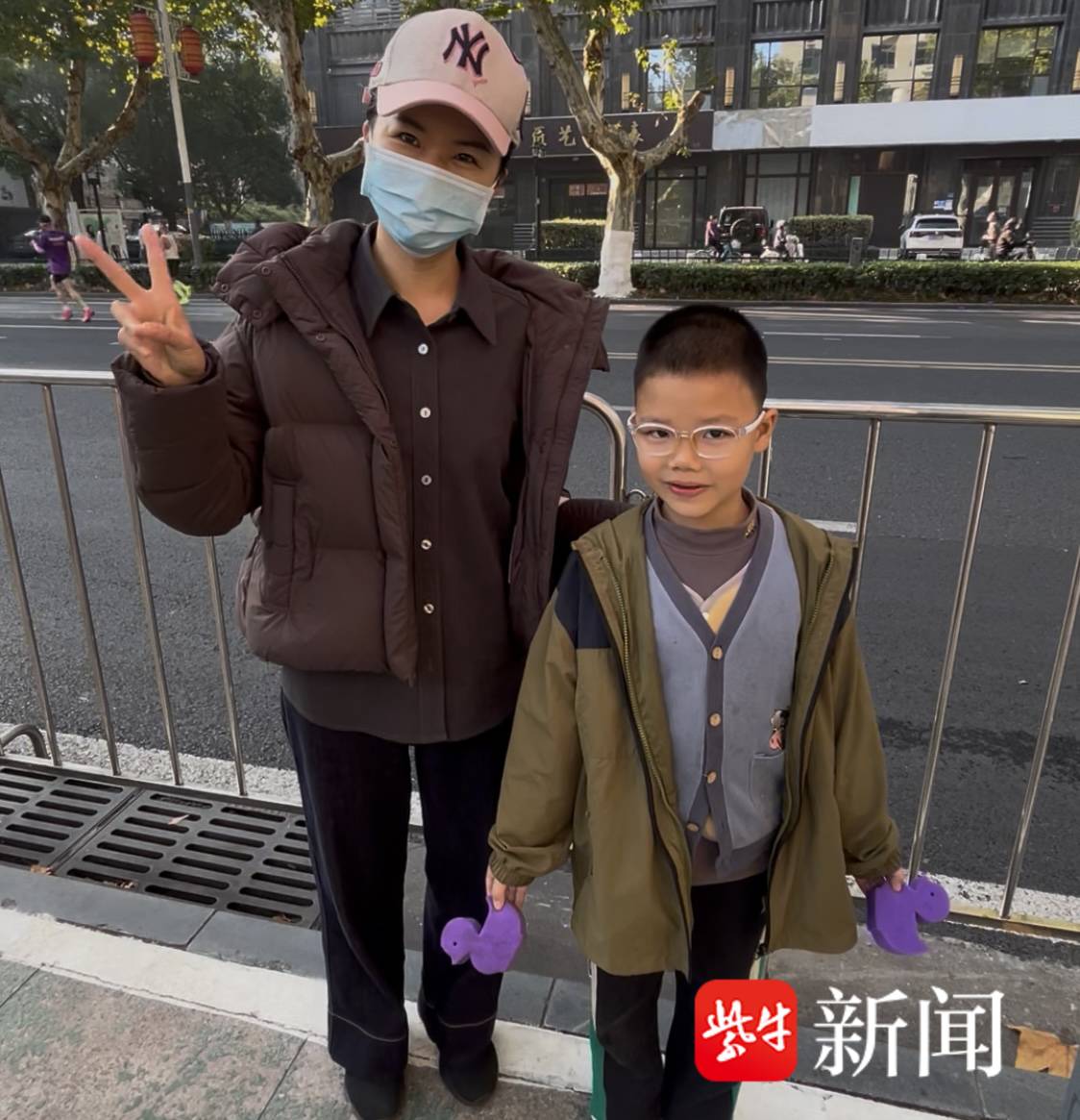 在南马长江路赛道旁,扬子晚报/紫牛新闻记者发现了一位不断在为南马助威的小朋友,记者采访得知,他就读于赛道旁的长江路小学,这次在妈妈的带领下,第一次近距离感受马拉松比赛的氛围。