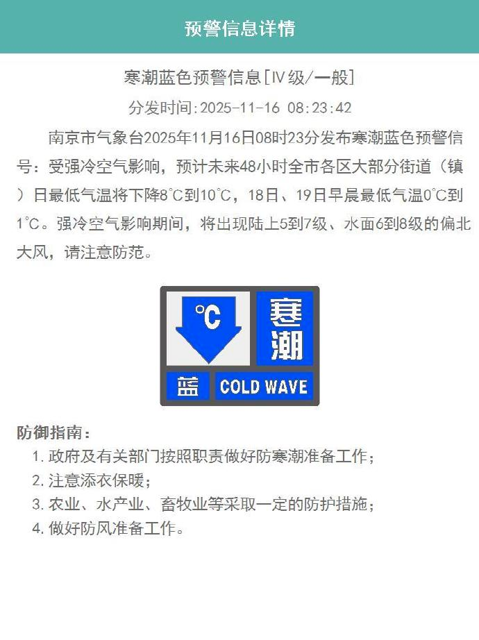 受强冷空气影响,预计未来48小时全市各区大部分街道(镇)日最低气温将下降8℃到10℃,18日、19日早晨最低气温0℃到1℃。强冷空气影响期间,将出现陆上5到7级、水面6到8级的偏北大风,请注意防范。