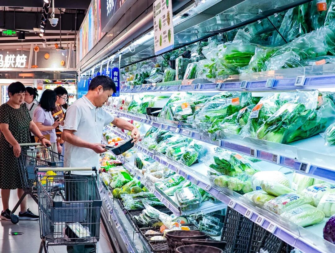 南京一家盒马鲜生店内,市民正在选购蔬菜。