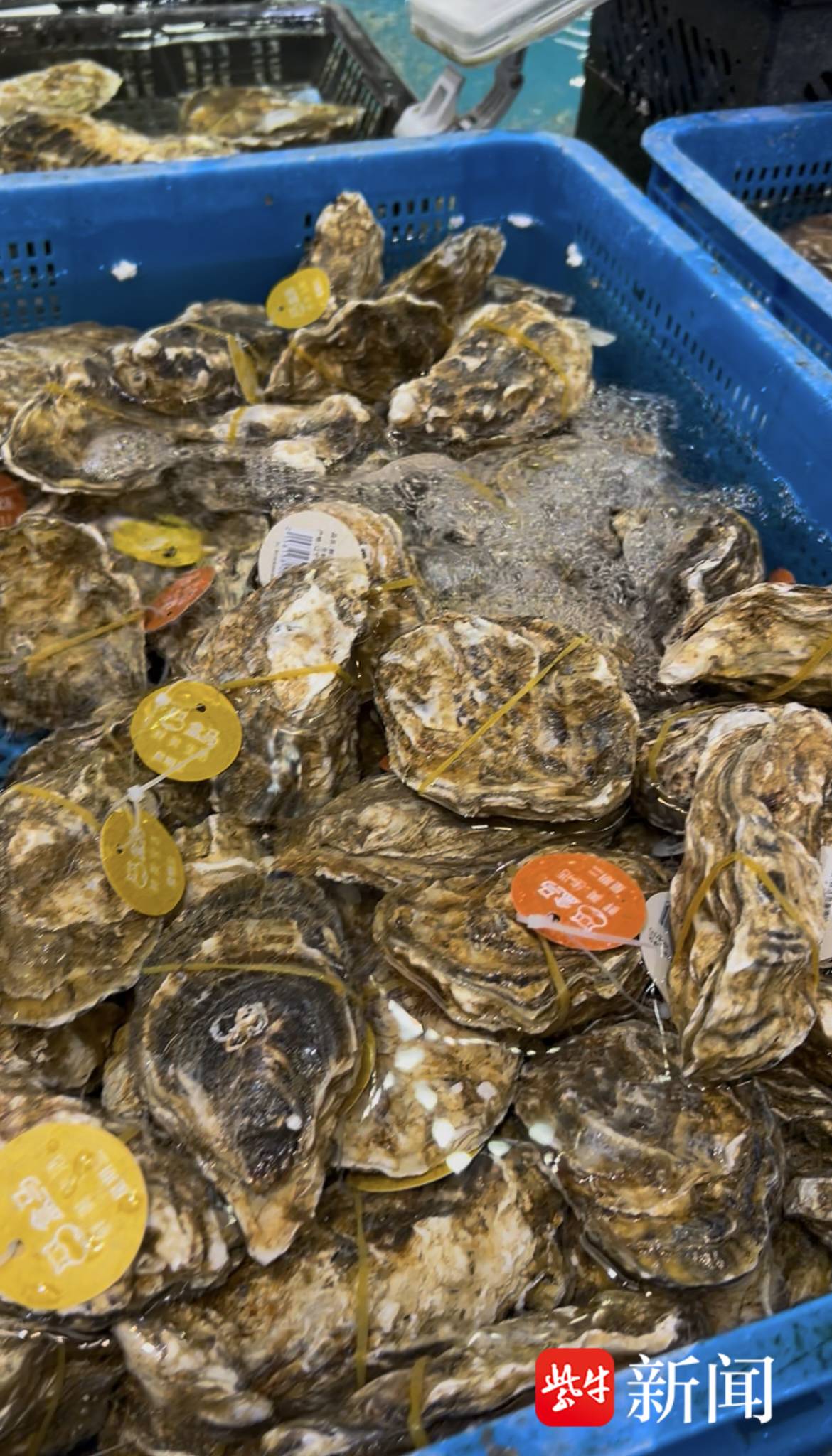 除了梭子蟹,11月也是生蚝肥美的时节。盒马的生蚝产自渤海湾的大连,7.9元一个,个个肉质丰腴,个头有成人手掌那么长,也十分受欢迎,临近下班时间,当日生蚝已经卖掉了七八成。