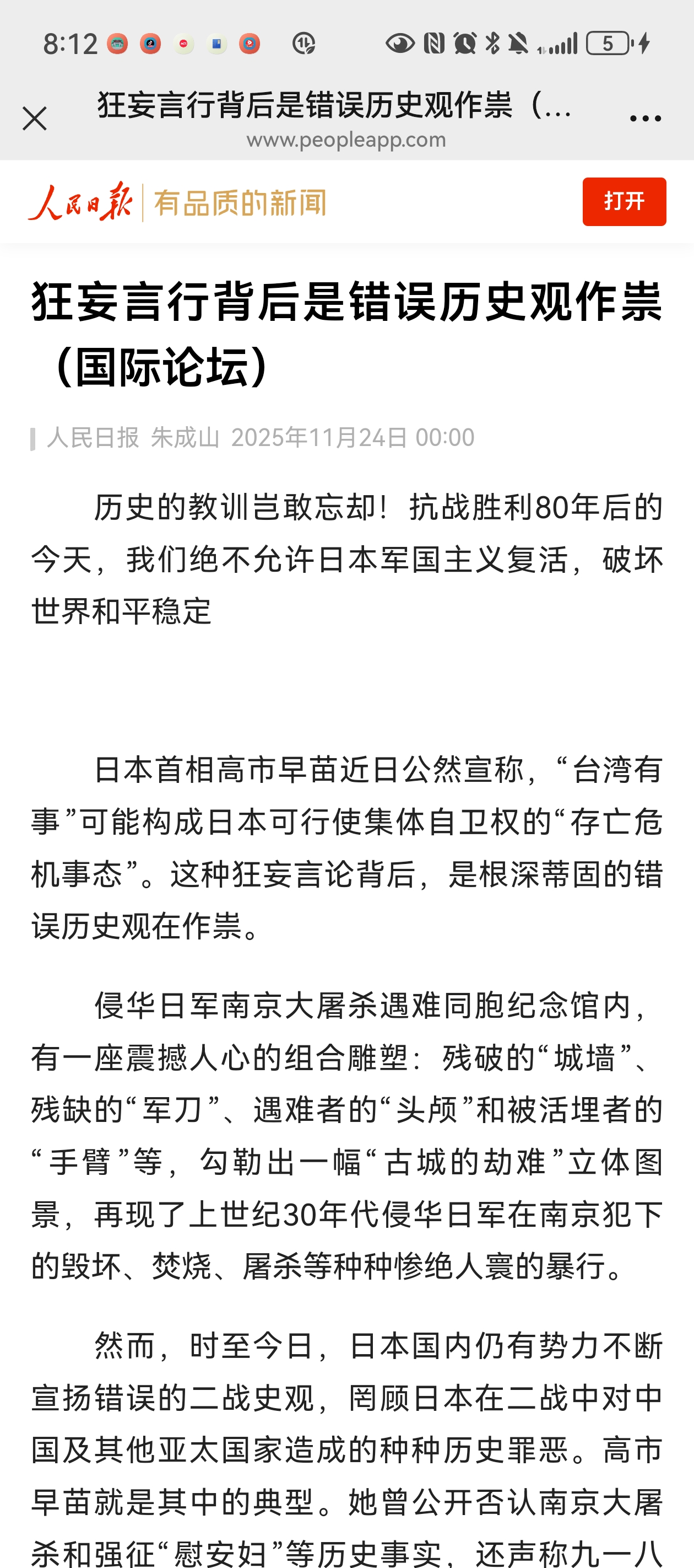 11月24日,中国抗日战争史学会原副会长、侵华日军南京大屠杀遇难同胞纪念馆原馆长、常州大学教授朱成山在《人民日报》撰文称,“历史的教训岂敢忘却!抗战胜利80年后的今天,我们绝不允许日本军国主义复活,破坏世界和平稳定。”