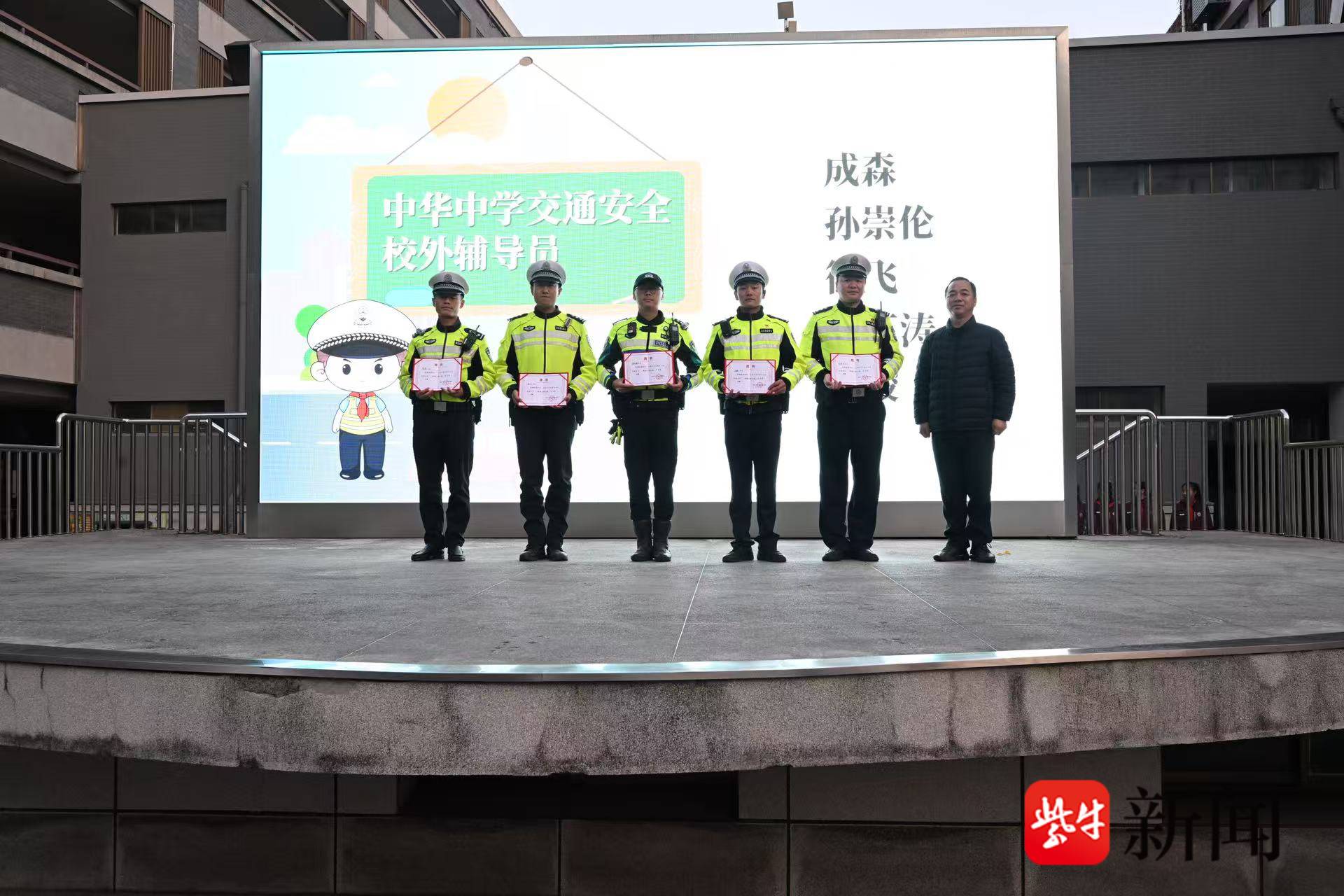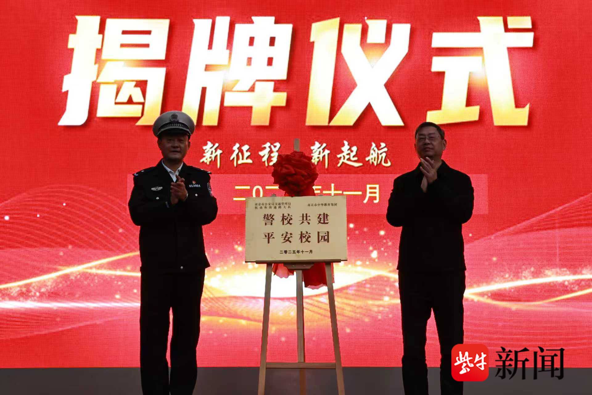 活动伊始,校领导为在前期交通安全主题创作(绘画、作文)中表现优异的学生颁发证书,数名来自机动和快速路大队的民警也郑重接过“交通安全校外辅导员”聘书,标志着警方与学校在安全教育领域长效合作机制建立,为未来持续开展校园安全活动奠定基石。南京市公安局交管局高宣颐副局长与南京中华教育集团李兵书记共同为“警校共建 平安校园”铜牌揭牌。