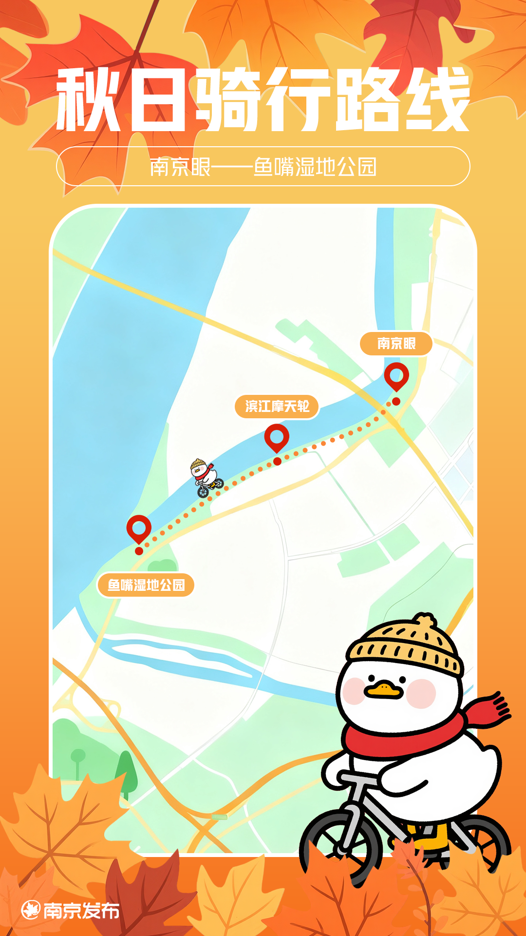 路线特点:自南京地标之一的“南京眼”启程,途经滨江摩天轮,最终抵达鱼嘴湿地公园。这条骑行路线不长,却承载了青奥时期的文化与活力,在这里可以感受那份独特的青春气息。